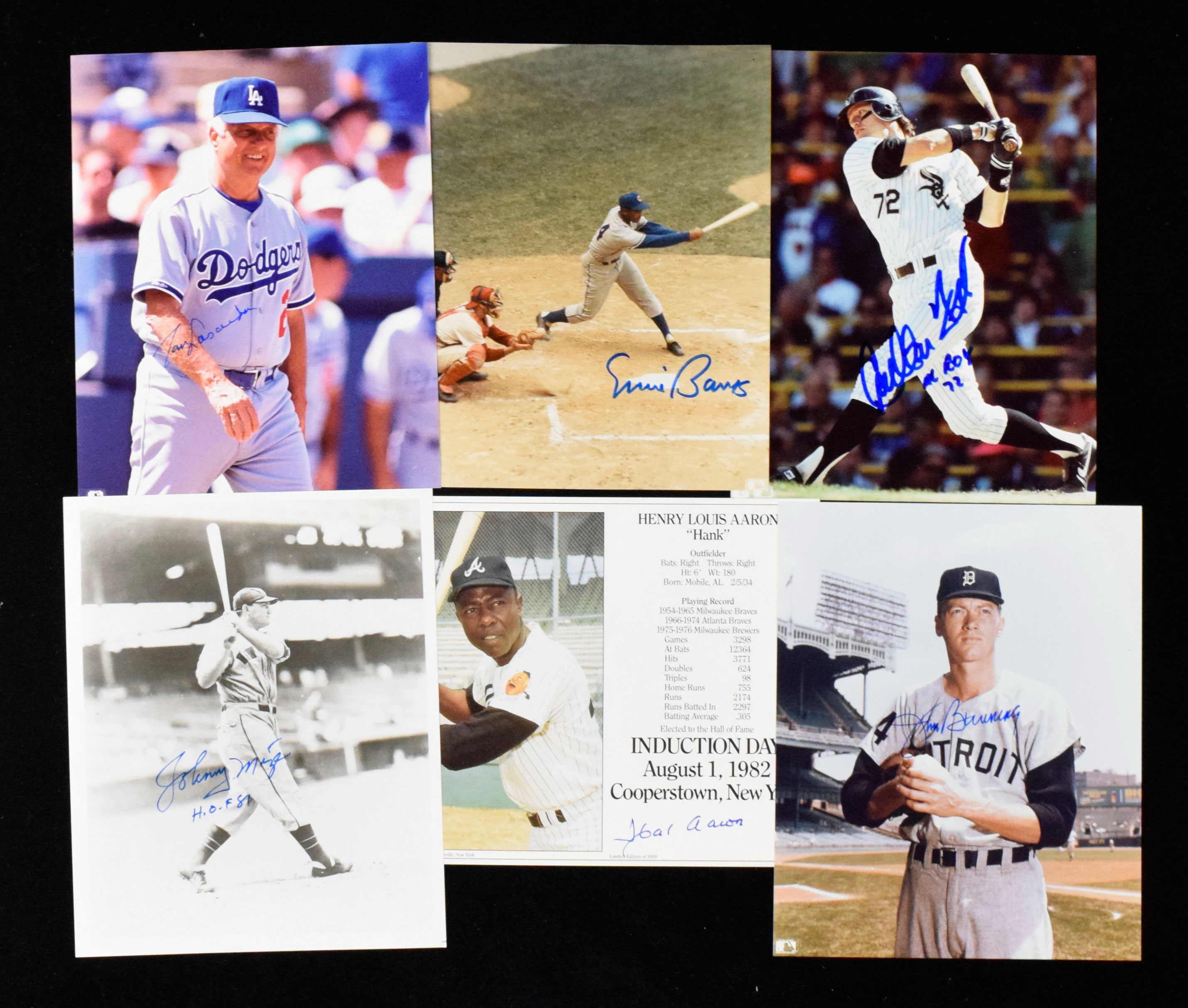 Description:Lot of (12) Baseball HOFers signed 8"x10" photographs (NM-NM/MT overall). Includes Hank Aaron, Jim Bunning, Ernie Banks, Johnny Mize with "HOF 81" inscription, Rick Ferrell with "HOF 1984" inscription, Carlton Fisk with "AL ROY 72" inscription, Fergie Jenkins with "Cy Young 1971" "HOF 91" inscriptions, Gaylord Perry with "HOF 1991" "314" inscriptions, Bert Blyleven, Pete Rose, Tom Lasorda, and A.B. Chandler. Signatures rate 8 to 10 out of 10: NM-NM/MT overall