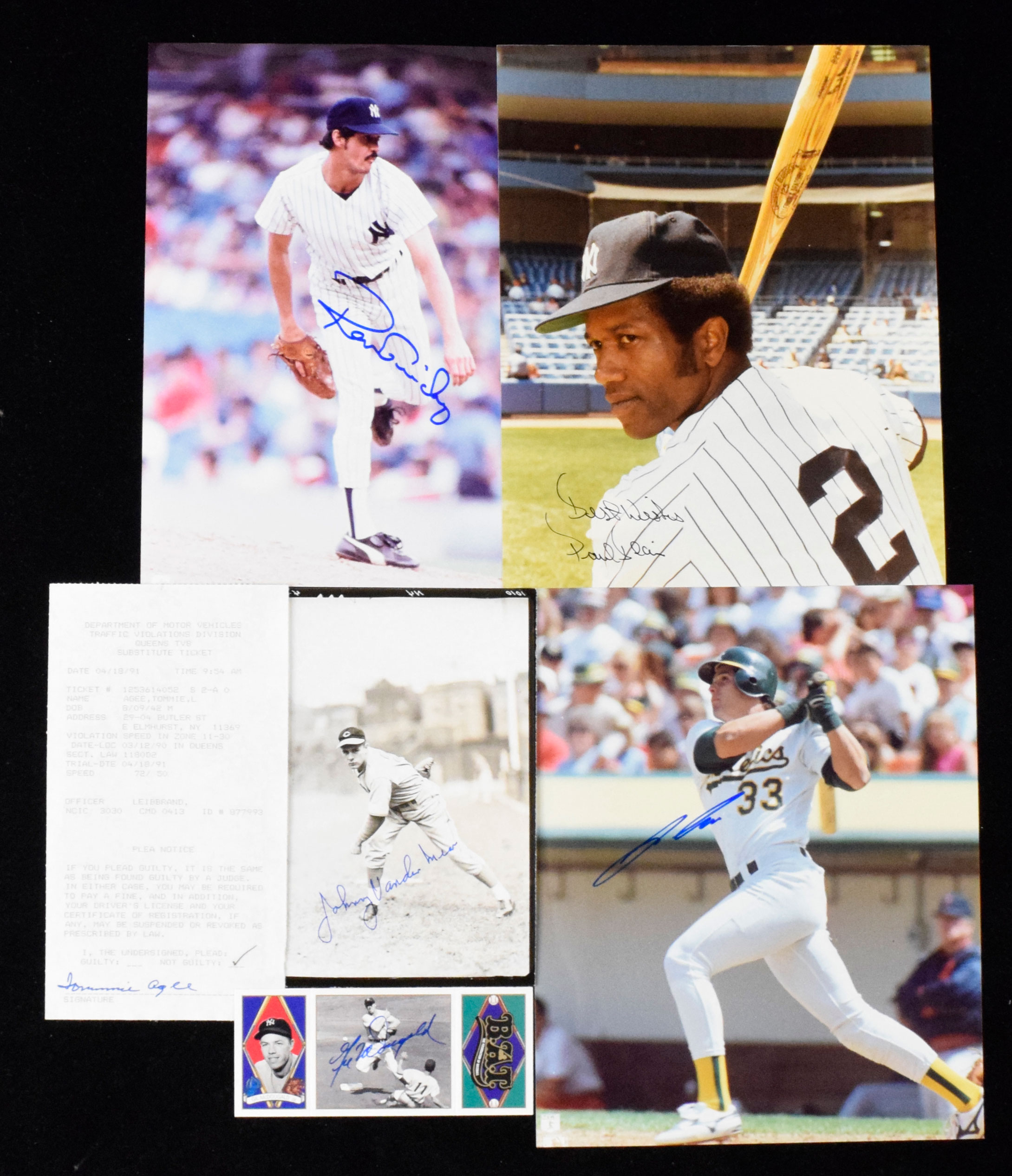 Description:Baseball autograph lot including some stars and fan favorites (EX-NM/MT). Includes 5"x7" photo signed by Johnny Vander Meer; 1991 DMV traffic ticket with Not Guilty plea signed by Tommie Agee; (11) signed 8"x10" photos: Paul Blair, Al Jackson, Jose Canseco, Ron Guidry, Dwight Gooden, Bernie Williams, Lenny Dykstra, Duffy Dyer, Willie Randolph, Dan Pasqua, and Jeff Johnson (personalized to Jan); (16) signed 1993 Upper Deck All-Time Heroes: (5) Gil McDougald, (3) Moose Skowron, (2) Tommie Agee, Jerry Grote, Bud Harrelson, (3) Bobby Richardson, and Luis Tiant. Signatures rate 7 to 10 (avg 8/9) out of 10: EX-NM/MT