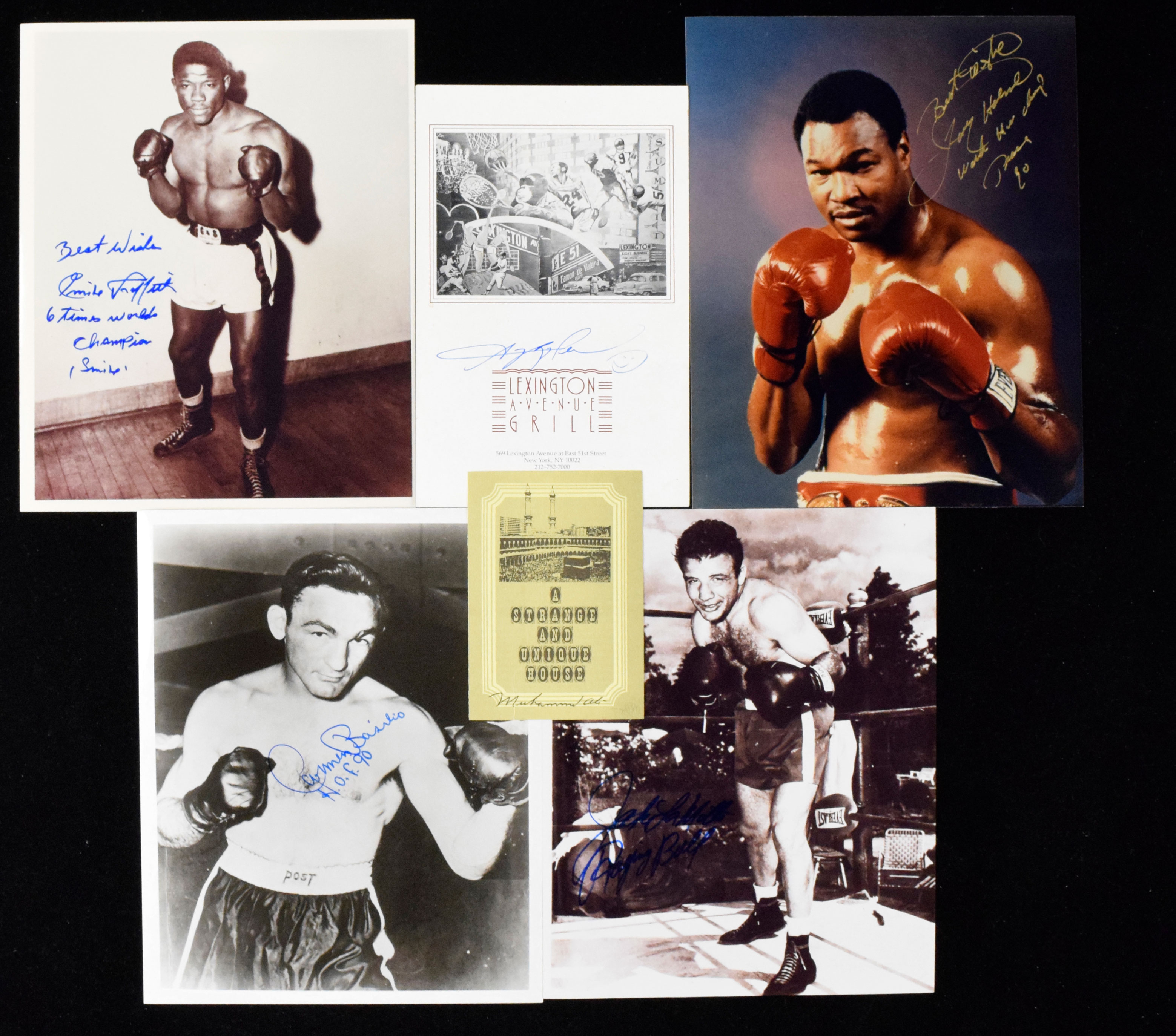 Description:Boxing HOFers autograph lot (EX-NM/MT). Includes (2) religious pamphlets signed by Muhammad Ali; (6) signed 8"x10" photos: Jake LaMotta with "Raging Bull" inscription, Carmen Basilio with "HOF 90" inscription, (2) Emile Griffith with "6 time world champion" inscription added to both, (2) Larry Holmes; and (3) 5.5"x8.5" Lexington Avenue Grill flyers signed by Sugar Ray Leonard (small stains). Signatures rate 8 to 10 out of 10: EX-NM/MT