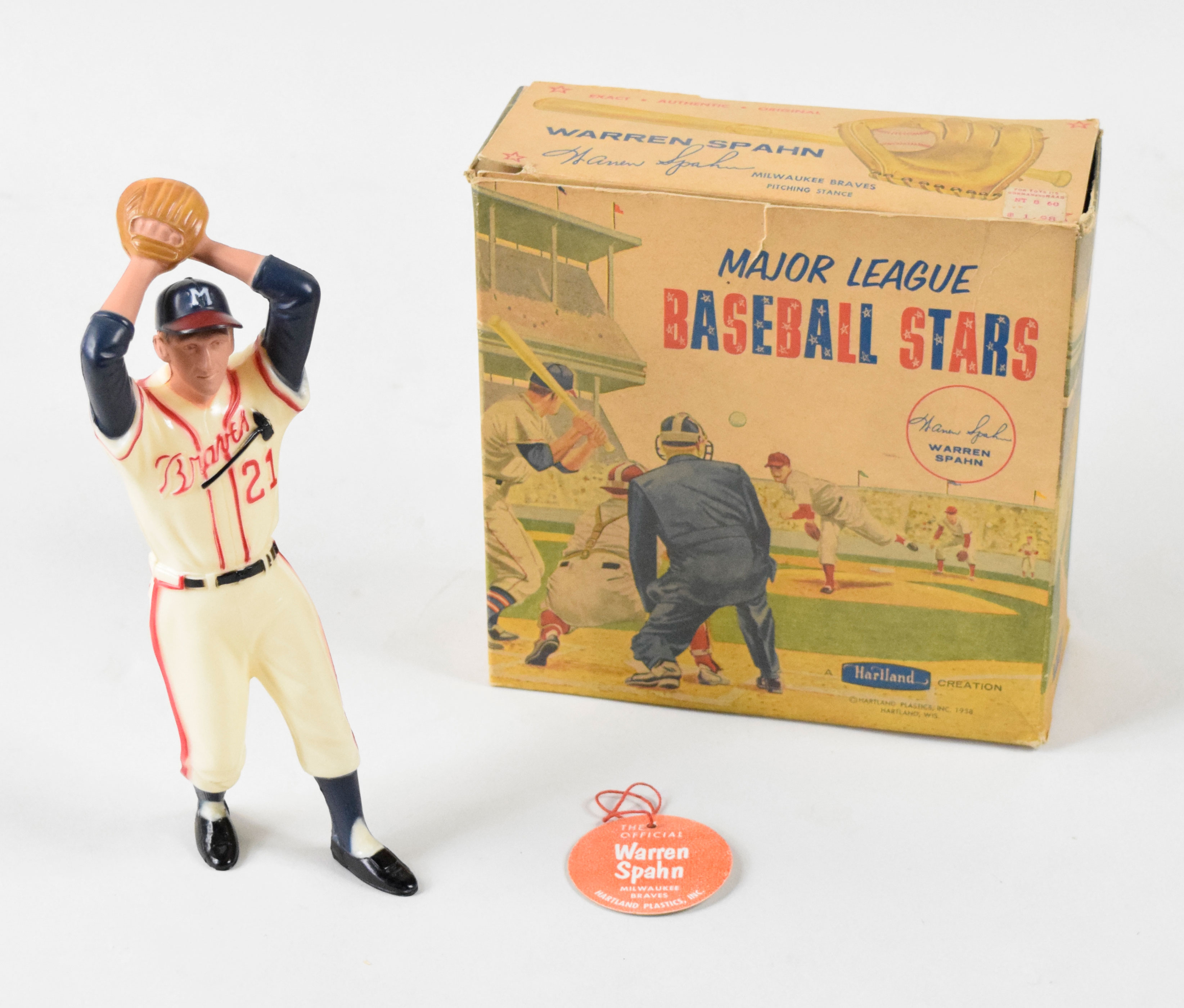 Description:Warren Spahn 1958 Hartland statue with original box and tag (see description). Statue grades NM overall with minimal wear. "$1.98" is written on the back of the tag, and box grades VG-VG/EX with handling/storage wear.