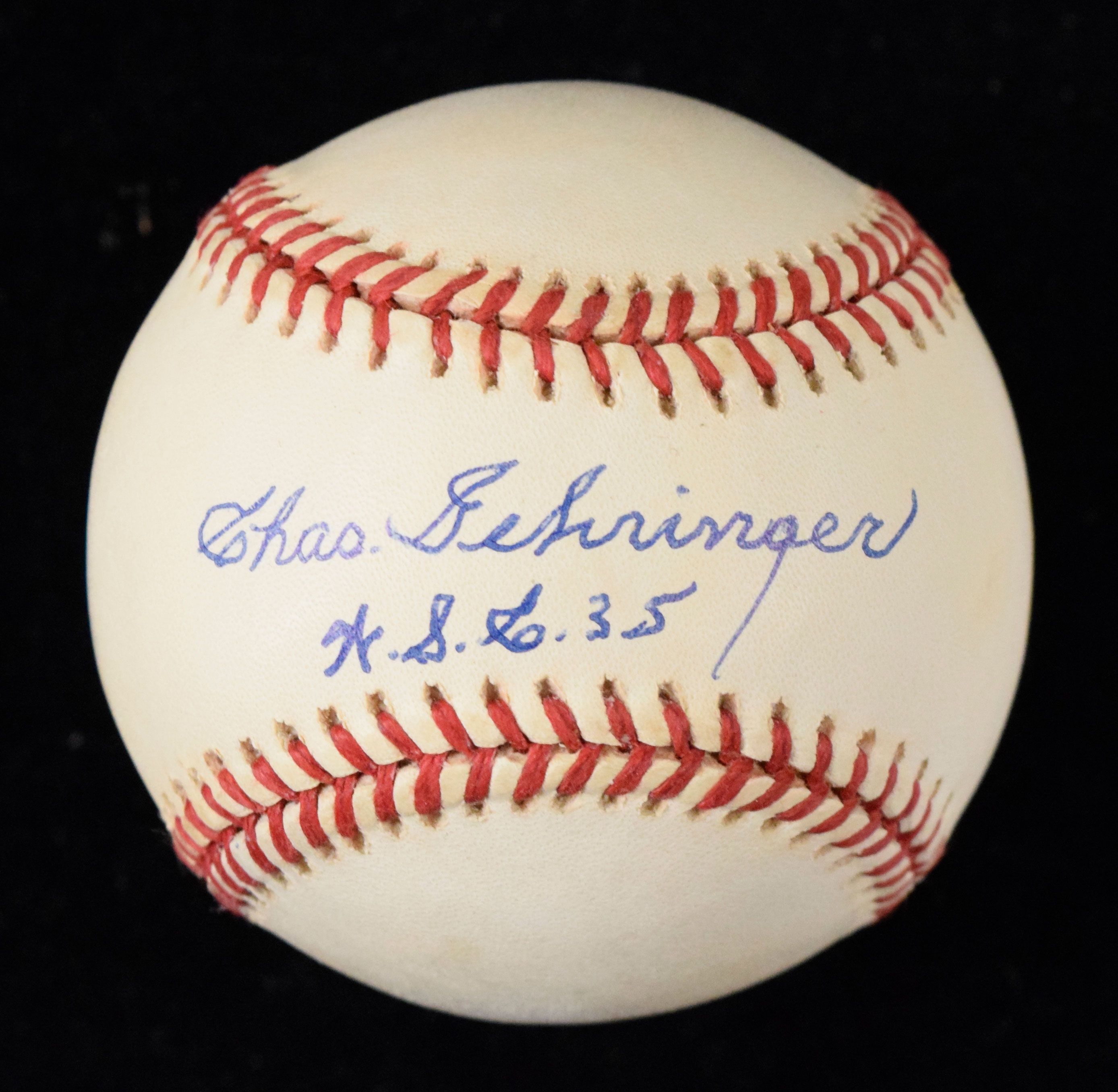 Description:Charlie Gehringer signed and inscribed B.Brown AL baseball (EX). Gehringer signed the sweet spot in blue ink and added "W.S.C. 35" inscription. Signature rates 8/9 out of 10. Toning mainly on the side panels away from the autograph: EX 2100000329663