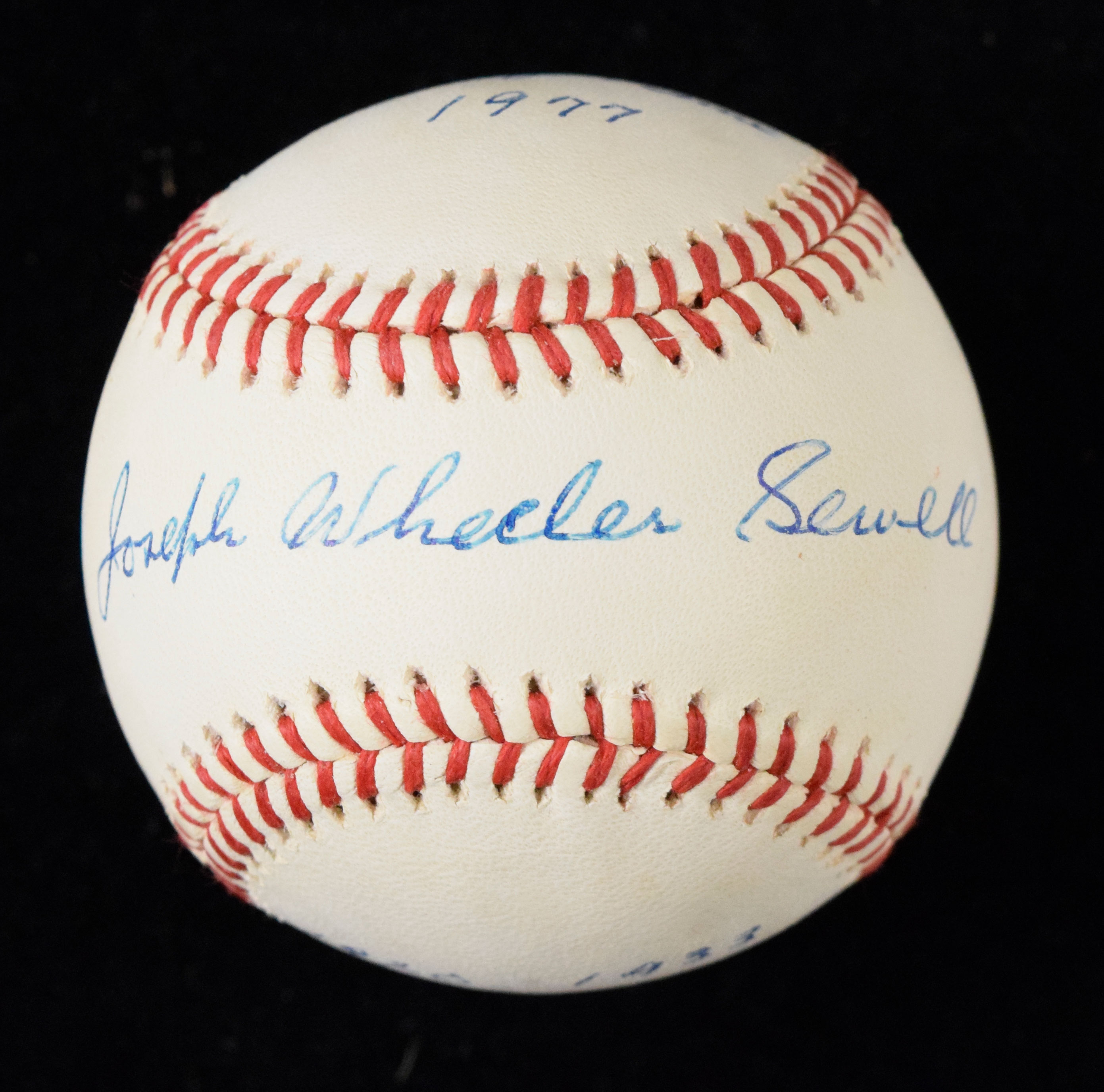Description:Joe Sewell full name signed and inscribed baseball (EX/MT). B.Brown AL ball signed by Joseph Wheeler Sewell in blue ink with "1920-1933" "Hall of Fame 1977" inscriptions. Signature rates 8 out of 10. Minor toning: EX/MT 2100000329731