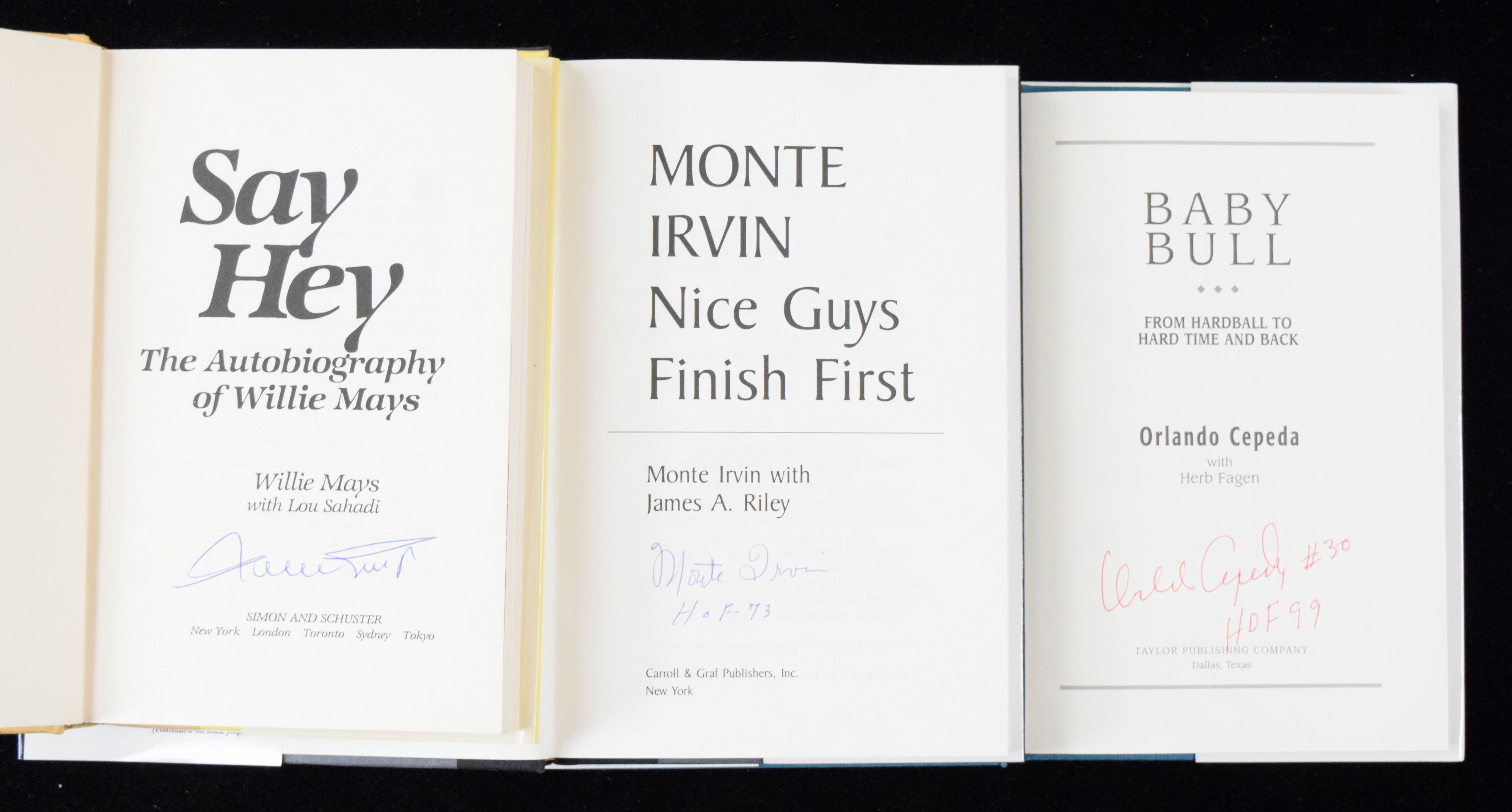 Description:Monte Irvin, Willie Mays, and Orlando Cepeda signed books (NM-NM/MT). Includes 1988 "Say Hey" signed by Willie Mays; 1996 "Nice Guys Finish First" signed by Monte Irvin with "HOF 73" inscription; and 1998 "Baby Bull" signed by Orlando Cepeda with "HOF 99" inscription. Signatures rate 9 to 10 out of 10: NM-NM/MT