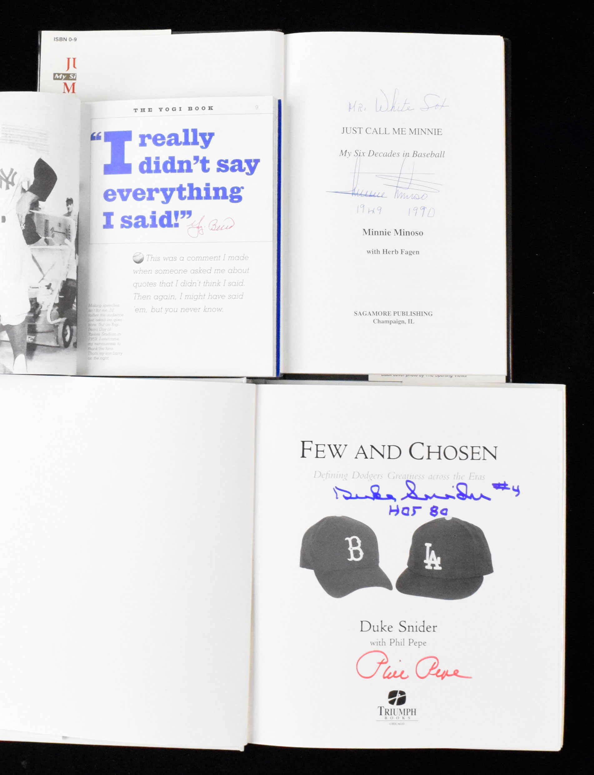 Description:Lot of (5) Baseball HOFers signed books (NM-NM/MT). Includes 1994 "Just Call Me Minnie" signed by Minnie Minoso with "Mr. White Sox" "1949-1990" inscriptions; 1996 "I Was Right On Time" signed by Buck O'Neil; 1998 "The Yogi Book" signed by Yogi Berra; 2006 "Few And Chosen: Defining Dodgers Greatness Across the Eras" signed by Duke Snider with "HOF 80" inscription and by co-author Phil Pepe; 2007 "Few And Chosen: Defining Negro Leagues Greatness" signed by Monte Irvin with "HOF 73" inscription and by co-author Phil Pepe. Signatures rate 8 to 10 out of 10: NM-NM/MT