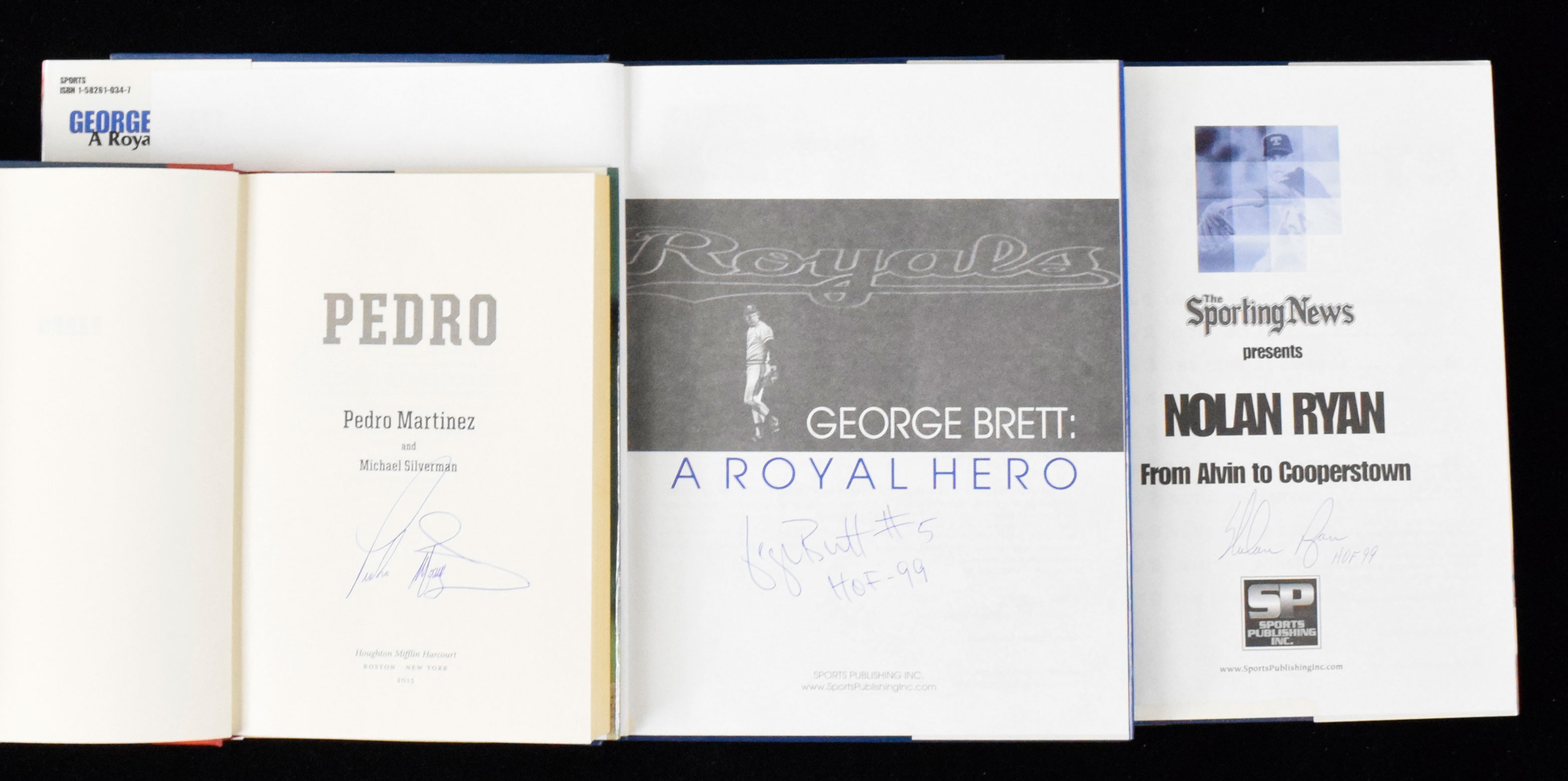 Description:Lot of (7) Baseball HOFers signed books (VG/EX-NM/MT). Includes 1999 "From Alvin to Cooperstown" signed by Nolan Ryan with "HOF 99" inscription (staining along the bottom edge); 1999 "A Royal Hero" signed by George Brett with "HOF 99" inscription; 2002 "Whitey's Boys" signed by Whitey Herzog with "HOF 2010" inscription; 2005 "3 Nights in August" signed by Tony LaRussa and by author Buzz Bissinger; 2010 Baseball HOF Yearbook multi-signed by Andre Dawson, Whitey Herzog, and Doug Harvey; 2014 "Brooks" signed by Brooks Robinson; and 2015 "Pedro" signed by Pedro Martinez. Signatures rate 6/7 (HOF yearbook) to 10 (avg 8/9) out of 10. Most books appear to average EX/MT-NM overall. Range: VG/EX-NM/MT