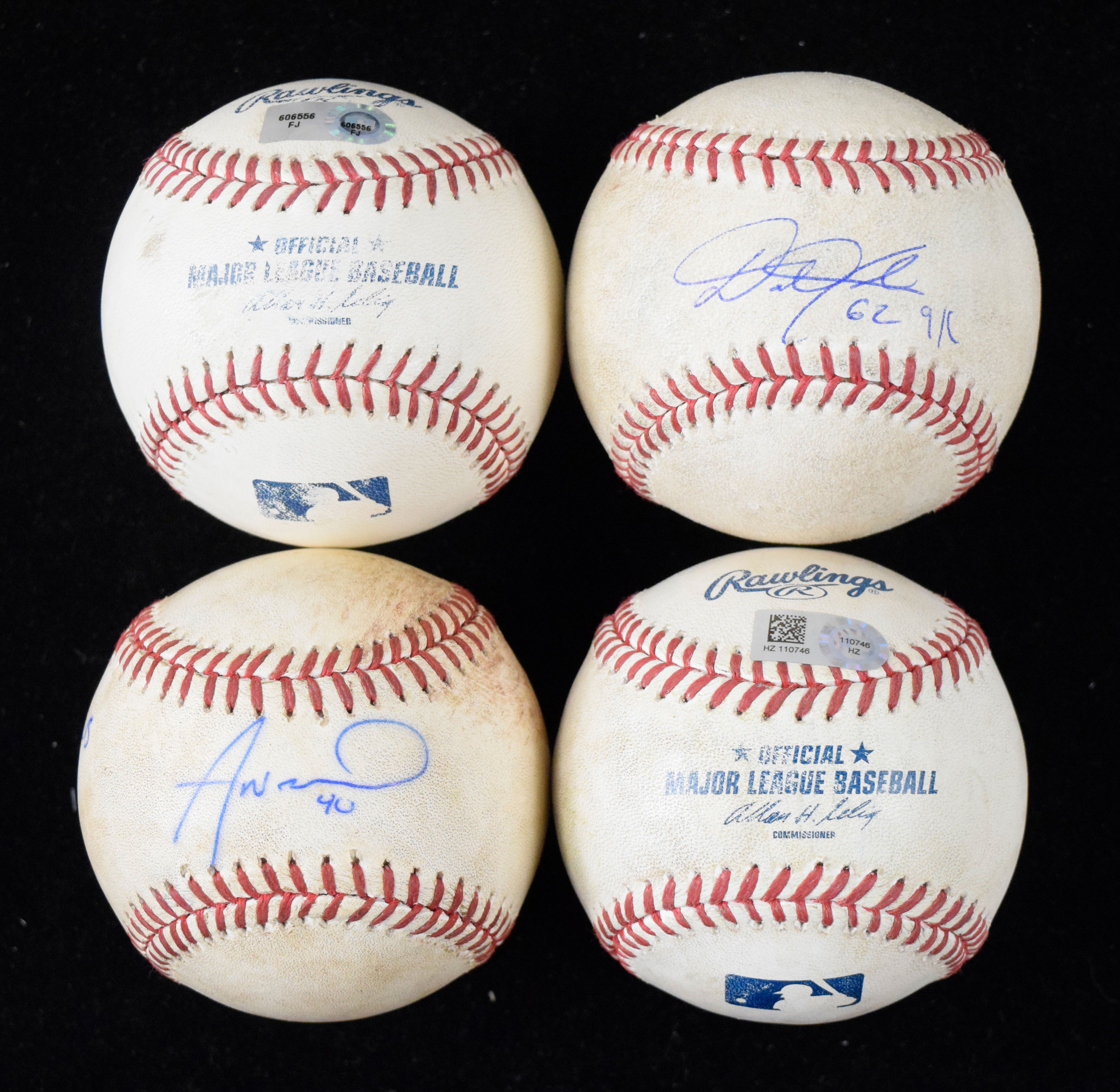 Description:Lot of (7) MLB Authenticated Braves game used baseballs (some interesting games) (3 autographed) (EX) Includes ball used in June 25, 2010 Billy Wagner 400th save game (LH861231); ball used in August 22, 2011 Jair Jurrjens 50th career win game (FJ606556); ball used in August 21, 2013 Craig Kimbrel 40th save game - first in MLB history with 40+ saves in first 3 seasons (EK509493); ball used in May 31, 2014 Braves game in which Craig Kimbrel tied John Smoltz for the Braves saves record (HZ110746); Mike Minor autographed ball used in August 17, 2010 game which was his first win (FJ186319); David Hale autographed baseball used in his September 13, 2013 debut game in which he struck out a record (9) batters (thrown by Hale in top of the 3rd) (EK699624); Alex Wood autographed baseball used in his July 30, 2013 first MLB win game (EK389853): EX
