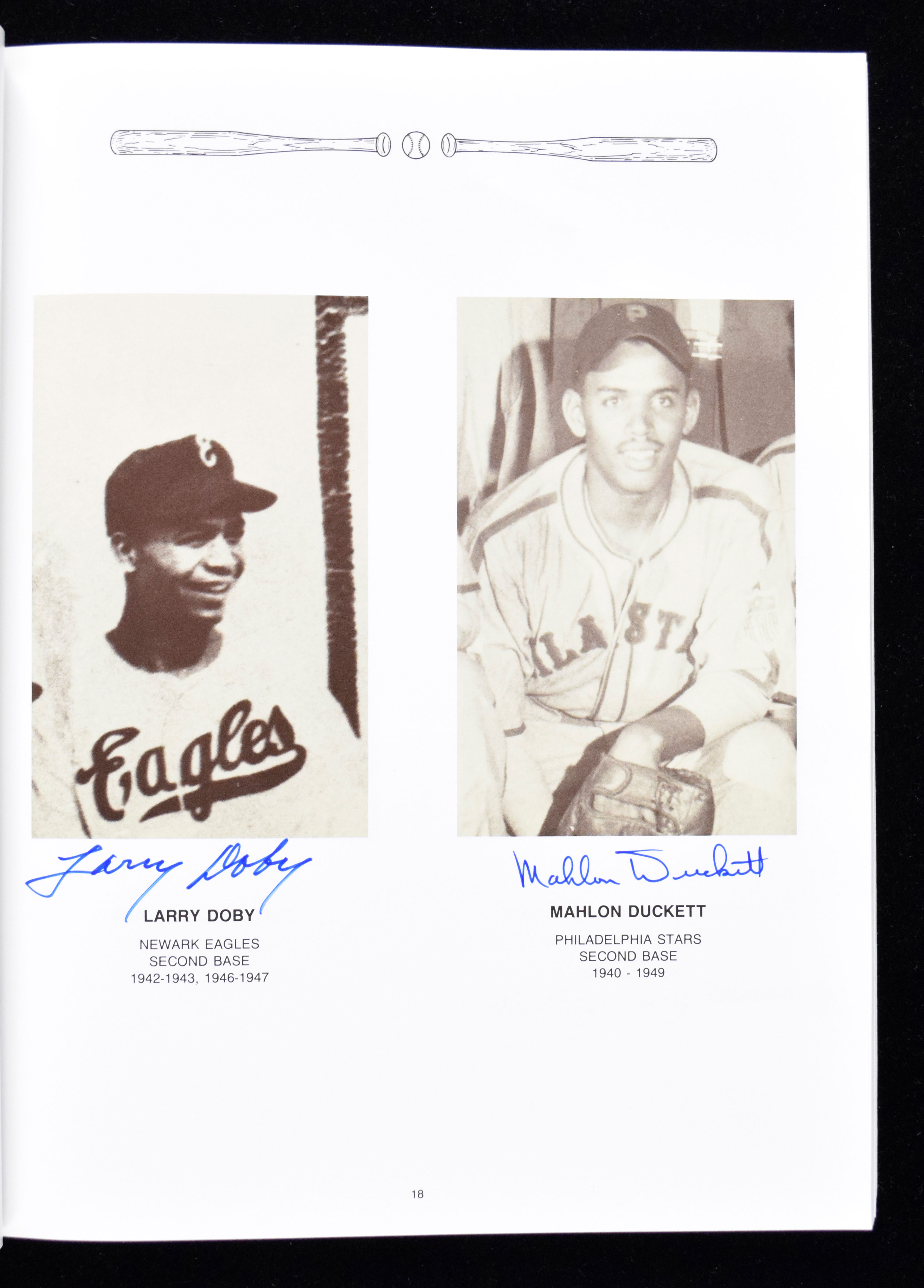 Description:Multi-signed 1992 "Pictorial Negro League Legends Album" including HOFers (NM). Signed by (35) including Buck Leonard (signed 3 times), Larry Doby (signed twice), Ray Dandridge, Leon Day, Monte Irvin, Minnie Minoso, Buck O'Neil, Double Duty Radliffe, Sam Jethroe, Nap Gulley, Ray Haggins, Andy Porter, William Bobby Robinson, Wilmer Harris, Clinton "Casey" Jones, Lester Lockett, Gordon "Hoppy" Hopkins, Leroy Ferrell, Henry Kimbro, Elbert Isreal, Jose Figueroa, Armando Vazquez, Charlie Biot, Herman "Doc" Horn, Sherwood Brewer, Jim "Fireball" Cohen, Jimmy Dean, Mahlon Duckett, Rodolfo "Rudy" Fernandez, Stanley Glenn, Toni Stone, Edsall Walker, Carl Dent, Bo Wallace, and Robert Scott. Signatures rate 7 to 10 (avg 8/9) out of 10: NM