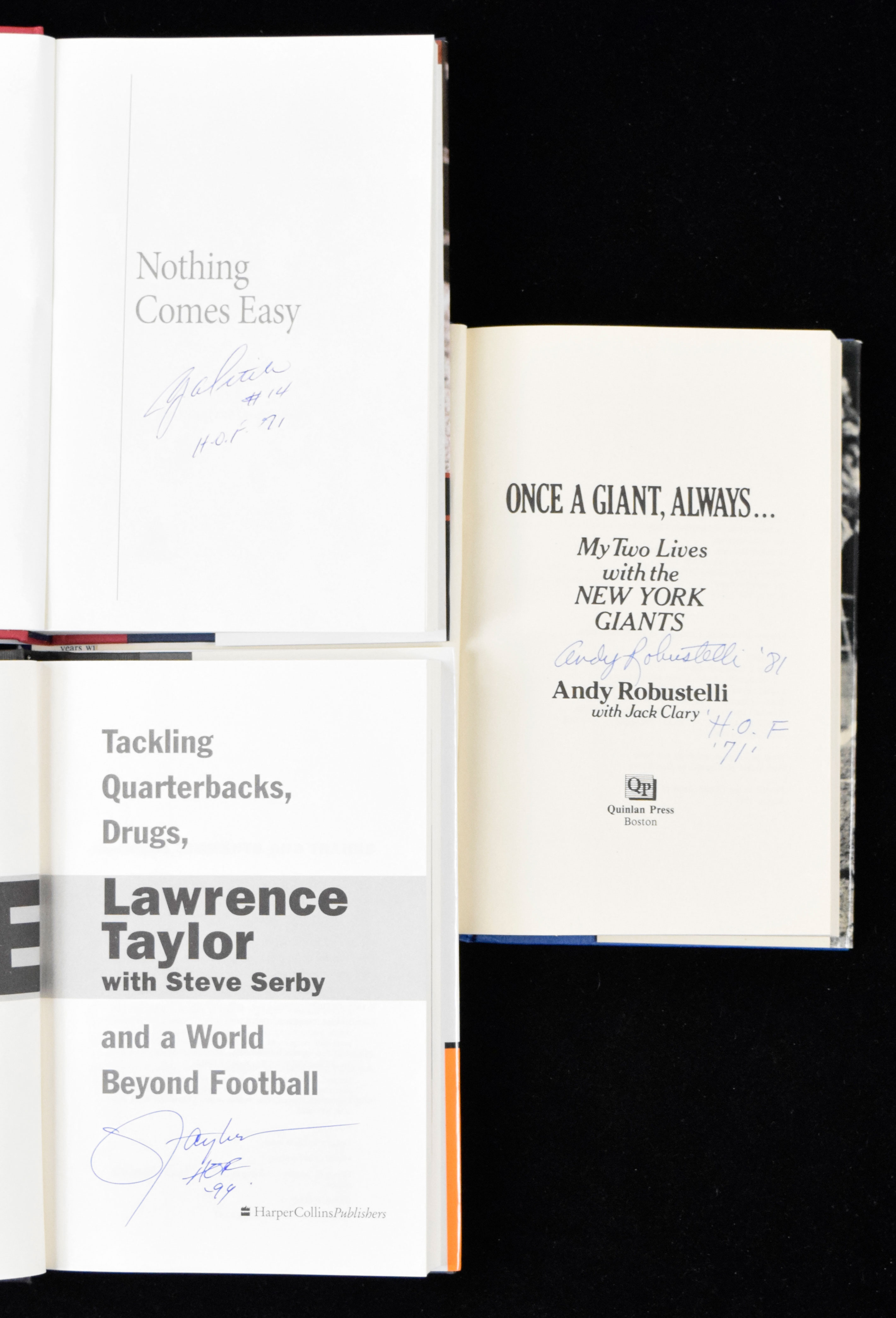 Description:Y.A. Tittle, Andy Robustelli, Michael Strahan, (2) Lawrence Taylor signed hardcover books (NM-NM/MT). Includes 1987 "Once A Giant, Always…" signed by Andy Robustelli with "HOF 71" inscription (comes with 4"x6" photo signed by Robustelli); 1987 "LT: Living On The Edge" signed by Lawrence Taylor; 2003 "LT: Over The Edge" signed by Lawrence Taylor with "HOF 94" inscription; 2007 "Inside the Helmet" signed by Michael Strahan; and 2009 "Nothing Comes Easy" signed by Y.A. Tittle with "HOF 71" inscription. Signatures rate 8 to 10 out of 10: NM-NM/MT