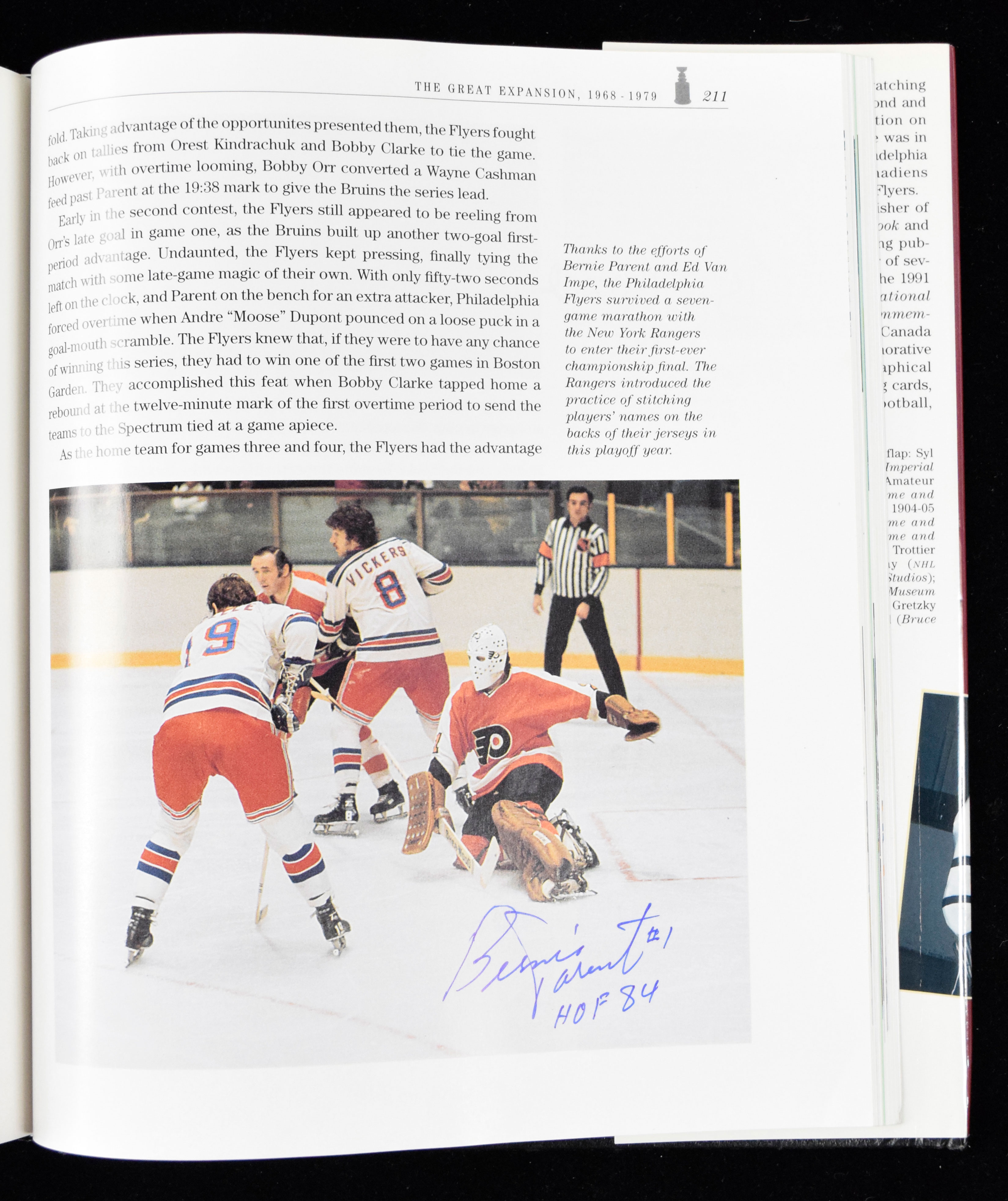 Description:Multi-signed 1992 "The Official National Hockey League Stanley Cup Centennial Book" (NM). Signed throughout the interior by (42) including Maurice Richard, Emile "Cat" Francis, Allan Stanley, Clint Smith, Ted Lindsay, Fern Flaman, Henri Richard (signed 3 times), Gump Worsley, Andy Bathgate (signed twice), Bobby Hull, Jean Beliveau, Stan Mikita, Yvan Cournoyer, Bernie Parent (signed 3 times), Frank Mahovlich, Brad Park, Tony Esposito, Bobby Clarke, Bill Barber, Guy Lafleur, Phil Esposito, Mike Bossy, Bryan Trottier (signed twice), Denis Potvin (signed twice), Bill Smith, Clark Gillies, Emile "Butch" Bouchard, Al Arbour, Vic Hadfield, Gilles Villemure, Sergei Nemchinov, Bruce Driver, Mathieu Schneider, Bryan McCabe, Todd Bertuzzi, Dave Schultz (signed twice), Reggie Leach, Butch Goring (signed twice), Dave Langevin, Bobby Nystrom, Wayne Merrick, and Ken Morrow. Signatures rate 8 to 10 out of 10: NM