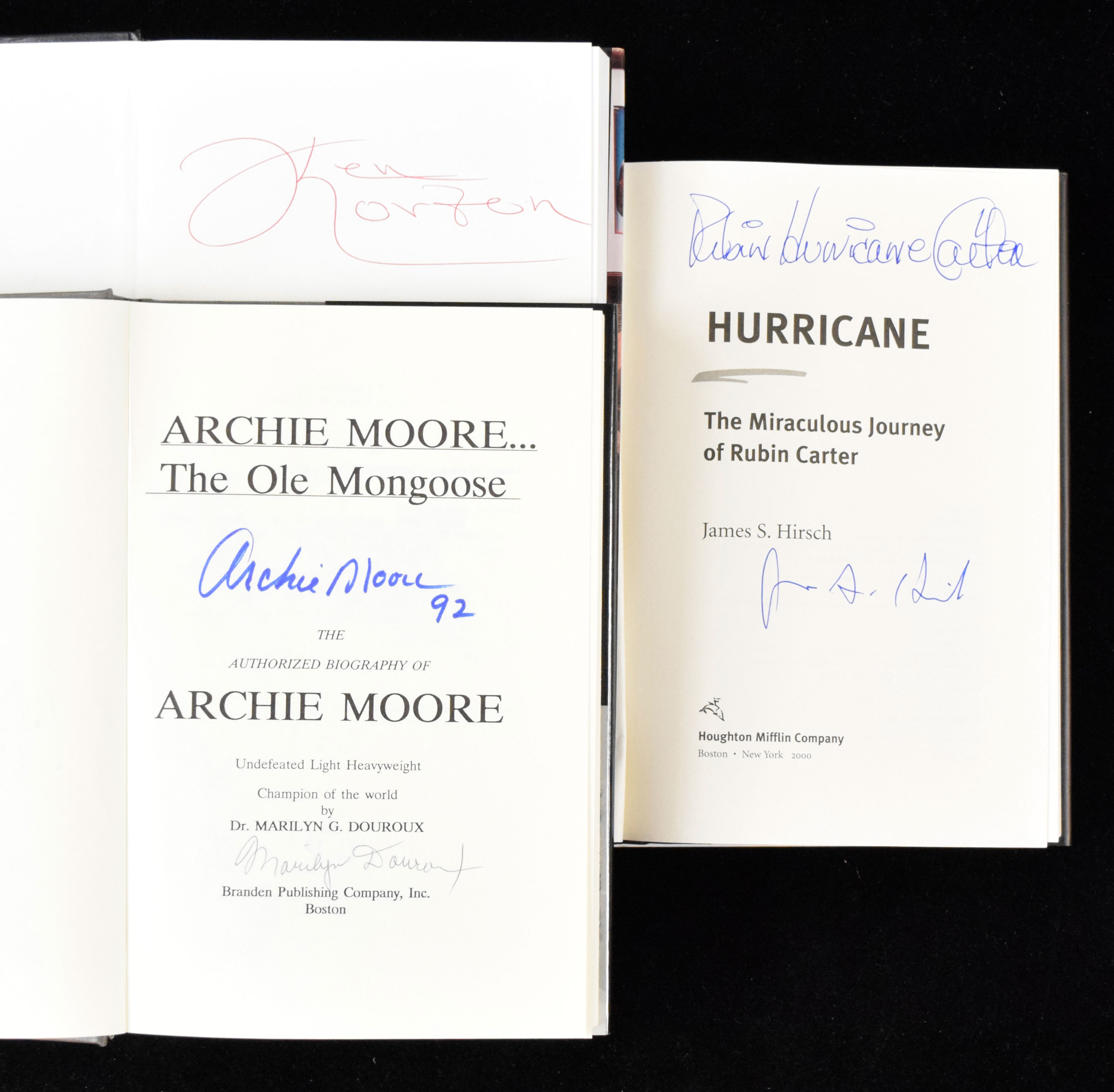 Description:Lot of (5) boxing stars and HOFers signed hardcover books (NM-NM/MT). Includes 1991 "The Old Mongoose" signed by Archie Moore" and by author Marilyn Douroux; 1998 "Let's Get It On" signed by Mills Lane with "Let's Get It On" inscription; 1999 "Golden Boy" signed by Oscar De La Hoya; 2000 "Going The Distance" signed by Ken Norton; 2000 "Hurricane" signed by Rubin "Hurricane" Carter and by author James Hirsch (comes with promotional flyer also signed by Carter). Signatures rate 8 to 10 out of 10: NM
