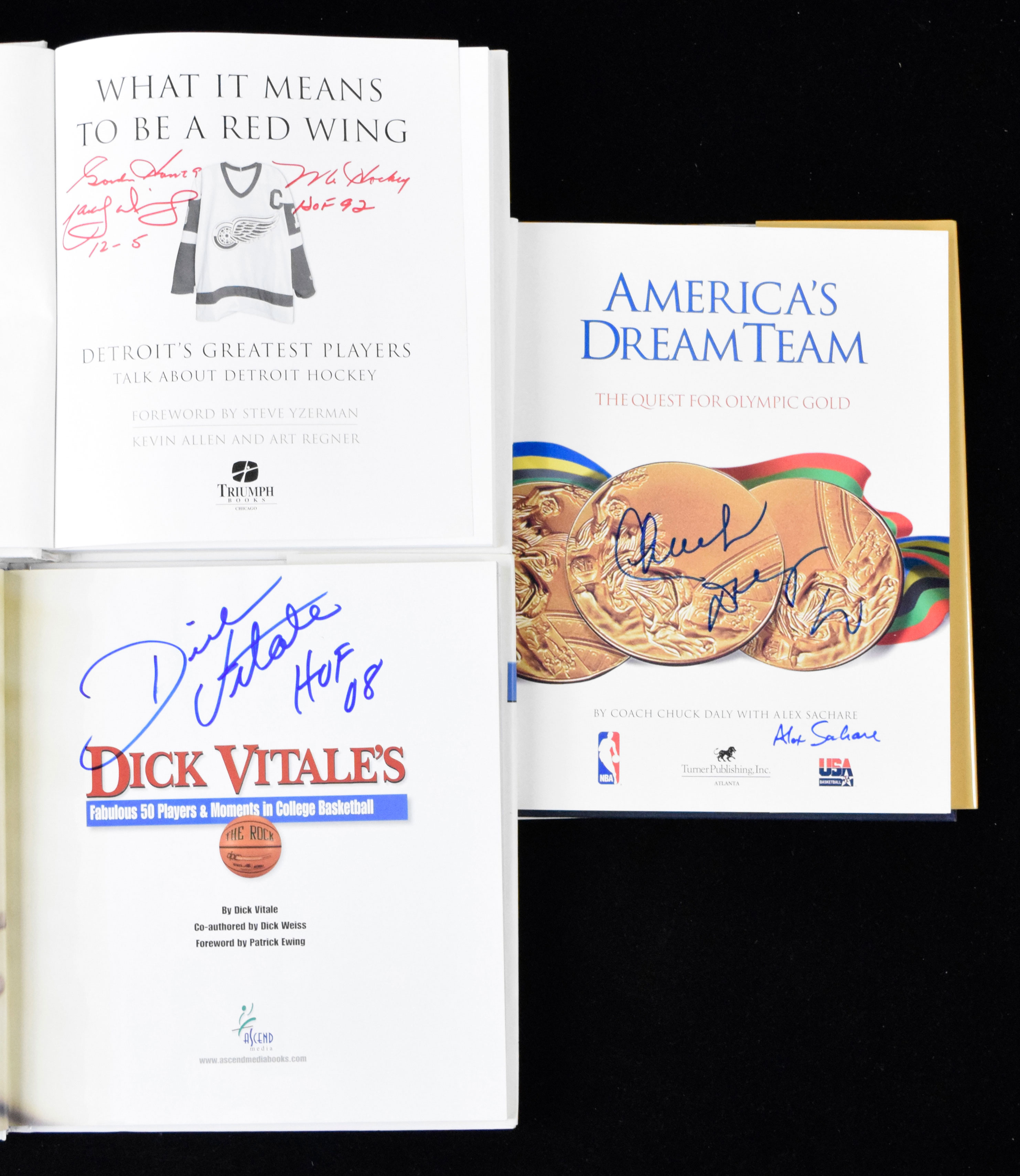 Description:Mixed sports lot of (8) stars and HOFers signed hardcover books (NM-NM/MT). Includes 1992 "America's Dream Team" signed by Chuck Daly and by co-author Alex Sachare; 1994 "Full Circle" signed by Dan Jansen with "94 USA Gold" inscription; 2006 "What It Means To Be A Red Wing" dual-signed by Gordie Howe with "Mr. Hockey" inscription and Marcel Dionne with "HOF 92" inscription; 2008 "Dick Vitale's Fabulous 50 Players & Moments in College Basketball" signed by Vitale with "HOF 08" inscription; 2008 "Pressure Ia A Privlidge" signed by Billie Jean King; 2012 "Grace, Gold & Glory" signed by Gabrielle Douglas; 2013 "Raising The Bar" signed by Gabrielle Douglas; and 2016 "Courage To Soar" signed by Simone Biles. Signatures rate 8 to 10 out of 10: NM-NM/MT