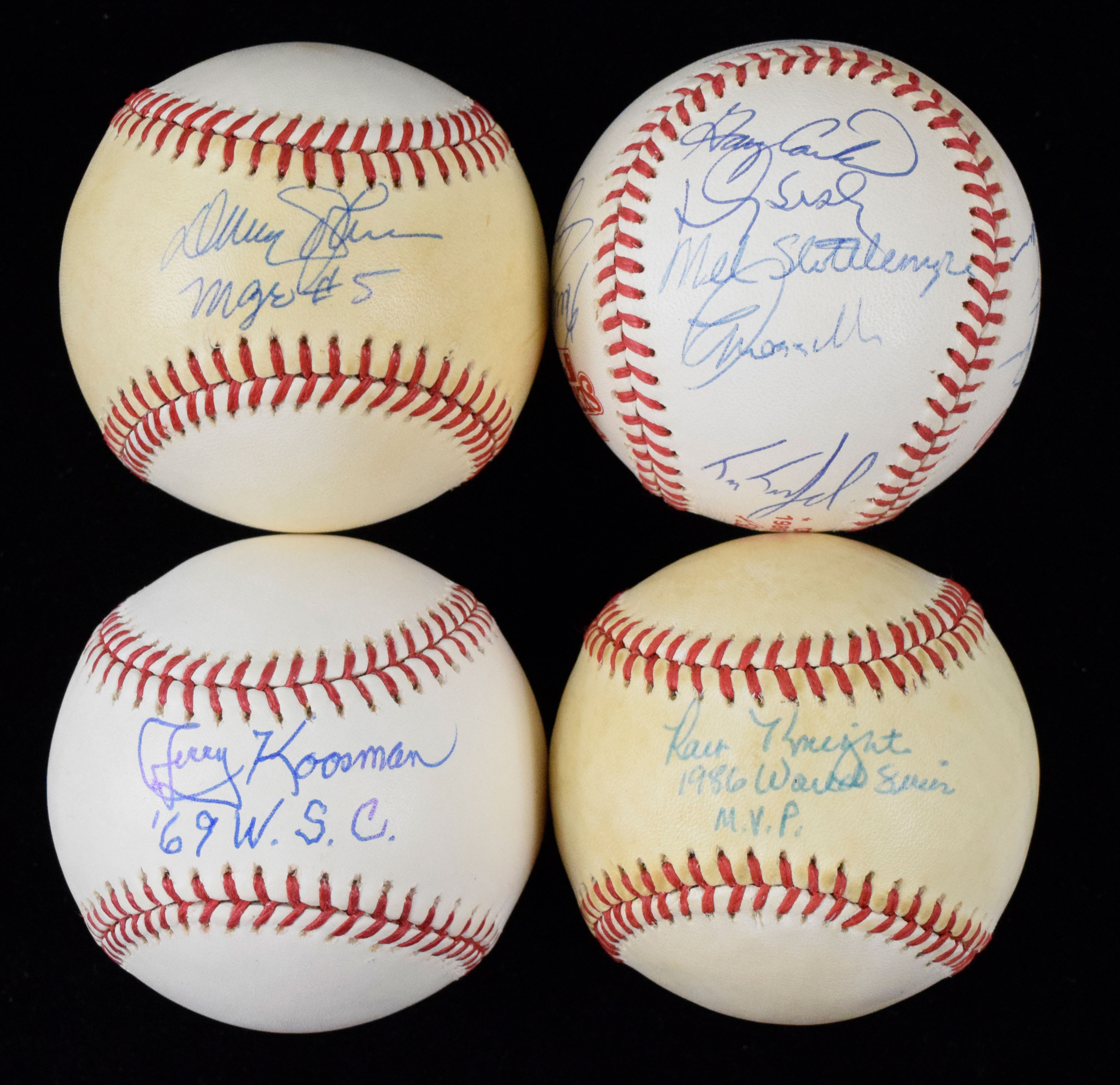 Description:Lot of (7) New York Mets signed baseballs including partial 1986 World Series ball (VG/EX-NM/MT). Includes B.Selig ML ball signed by Jerry Koosman with "69 W.S.C." inscription; 1986 World Series ball (toned) signed by Davey Johnson with "Mgr. #5" inscription; 1986 World Series ball (toned) signed by Ray Knight with "1986 World Series MVP" inscription; B.Selig ML ball signed by Jose Reyes; W.White NL ball (toned) signed by Lance Johnson with "1 DOG" inscription; W.White NL ball (toning) signed by Paul Wilson; and 1986 World Series ball signed by (15): Davey Johnson, Gary Carter, Keith Hernandez, Dwight Gooden, Mookie Wilson, Lenny Dykstra, Lee Mazzilli, Tim Teufel, Howard Johnson, Rafael Santana, Doug Sisk, Ed Hearn, Bud Harrelson, Bill Robinson, and Mel Stottlemyre. Signatures rate 7 to 10 (avg 8) out of 10: VG/EX-NM/MT