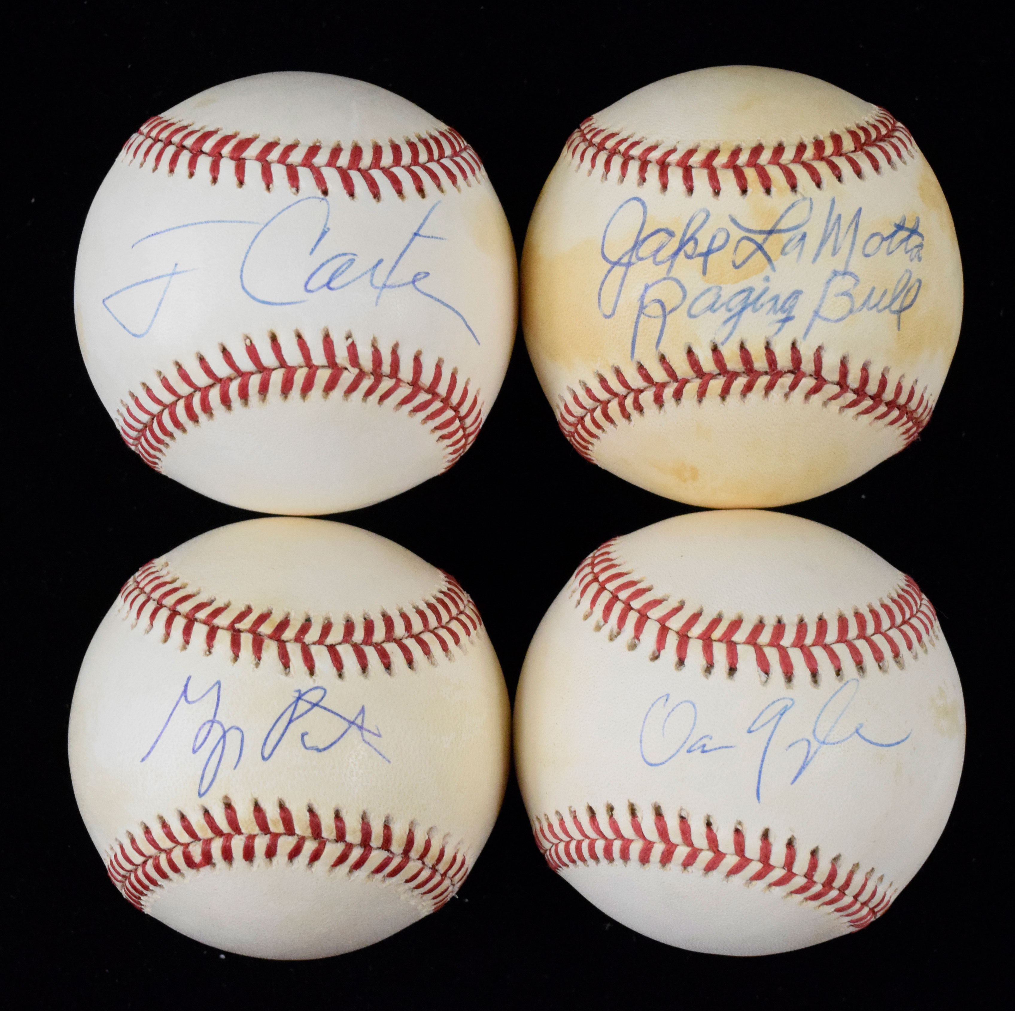 Description:Lot of (5) non baseball player signed baseballs (VG-EX/MT). Includes L.Coleman NL ball signed by Jake LaMotta with "Raging Bull" inscription, B.Brown AL ball signed by Jimmy Carter, B.Brown AL ball signed by Dan Quayle, W.White NL ball signed by George Pataki, and G.Budig Al ball dual-signed by Jimmy Smits & Dennis Franz. Signatures rate 7/8 to 9/10 out of 10. Most balls appear to average EX overall due to various degrees of toning (LaMotta most toned). Range: VG-EX/MT
