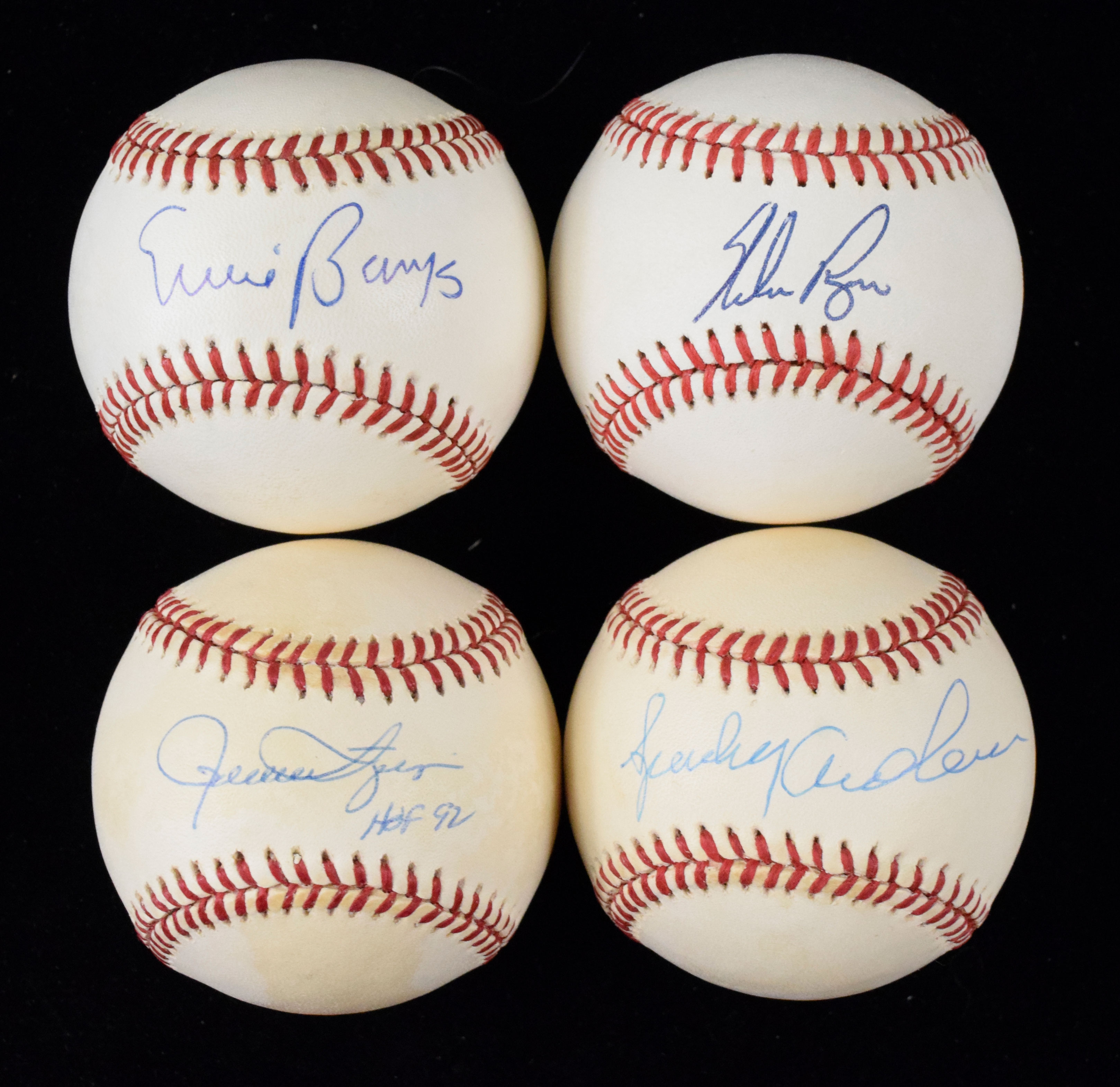 Description:Lot of (7) HOFers signed baseballs (VG/EX-NM). Includes W.White NL ball (light toning) signed by Sparky Anderson, W.White NL ball signed by Ernie Banks, B.Brown AL ball signed by Nolan Ryan, G.Budig AL ball (toning) signed by Rollie Fingers with "HOF 92" inscription, G.Budig AL ball (toning) signed by Goose Gossage, W.White NL ball (toned) signed by Buck O'Neil, and W.White NL ball (toned) signed by Lee Smith. Signatures rate 7/8 to 9/10 out of 10: VG/EX-NM