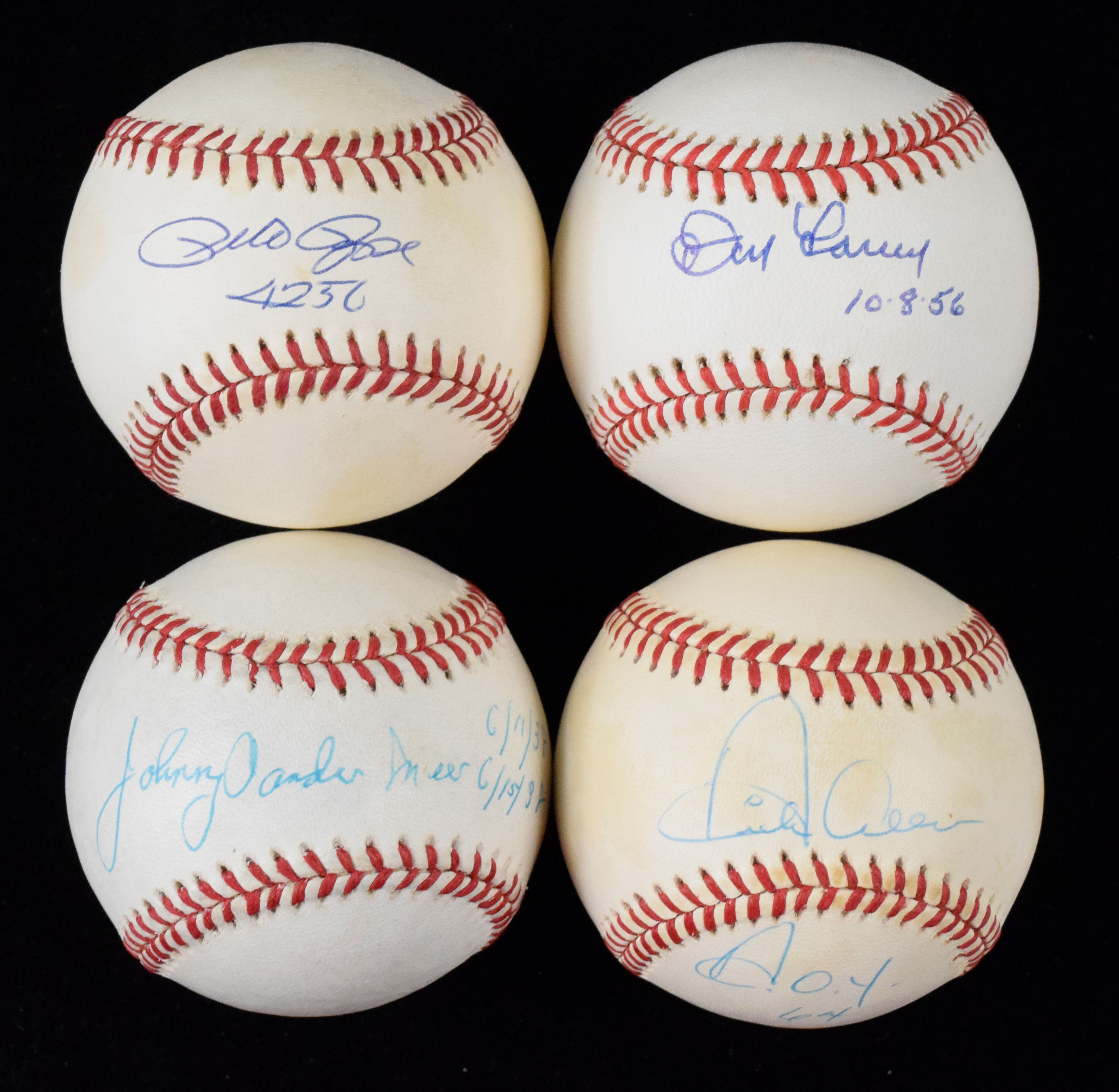 Description:Lot of (8) signed and inscribed baseballs (VG/EX-NM). Includes B.Giamatti NL ball (light toning) signed by Pete Rose with "4256" inscription, L.Coleman NL ball (toning) signed by Dick Allen with "ROY 64" inscription, G.Budig AL ball signed by Don Larsen with "10-5-56" inscription, L.Coleman NL ball (light toning) signed by Johnny Vander Meer with "6/11/38" "6/15/38" inscription, L.Coleman NL ball (light toning) signed by Tom Browning with "Cin vs LA 1-0" "PG 9-16-88" inscription, G.Budig AL ball signed by Denny McLain with "68-69 CY" inscription, G.Budig AL ball signed by Jack Aker with "#22 NY Yankees 1969-72" inscription, and L.Coleman NL ball (toned) signed by Felix "The Cat" Millan with "Braves 1969-71 A/S" "2 Gold Gloves" inscriptions. Signatures rate 6/7 (Millan) to 9/10 (avg 8) out of 10: VG/EX-NM