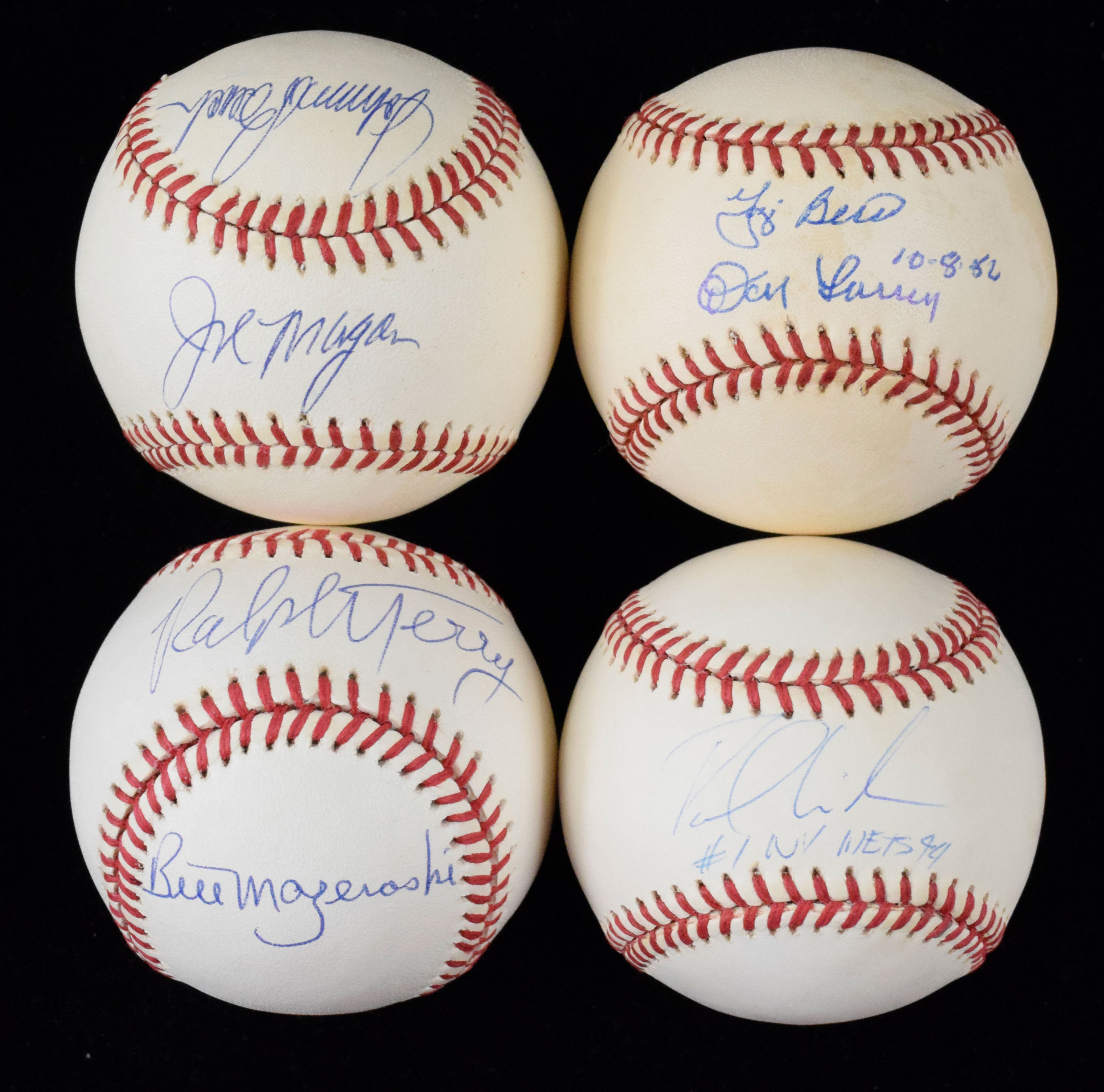 Description:Lot of (5) multi-signed baseballs (EX-NM). Includes W.White NL ball (light toning) dual-signed by Joe Morgan and Johnny Bench; G.Budig AL ball (toning) dual-signed by Yogi Berra and Don Larsen with Larsen adding "10-5-56" inscription; W.White NL ball dual-signed by Bill Mazeroski and Ralph Terry; W.White NL ball (toning) multi-signed by Felipe, Jesus, and Mateo Alou; W.White NL ball (light toning) multi-signed by Jason Isringhausen, Bill Pulsipher, and Paul Wilson with Wilson adding #1 NY Mets '94" inscription. Signatures rate 7 to 9/10 (avg 8) out of 10: EX-NM