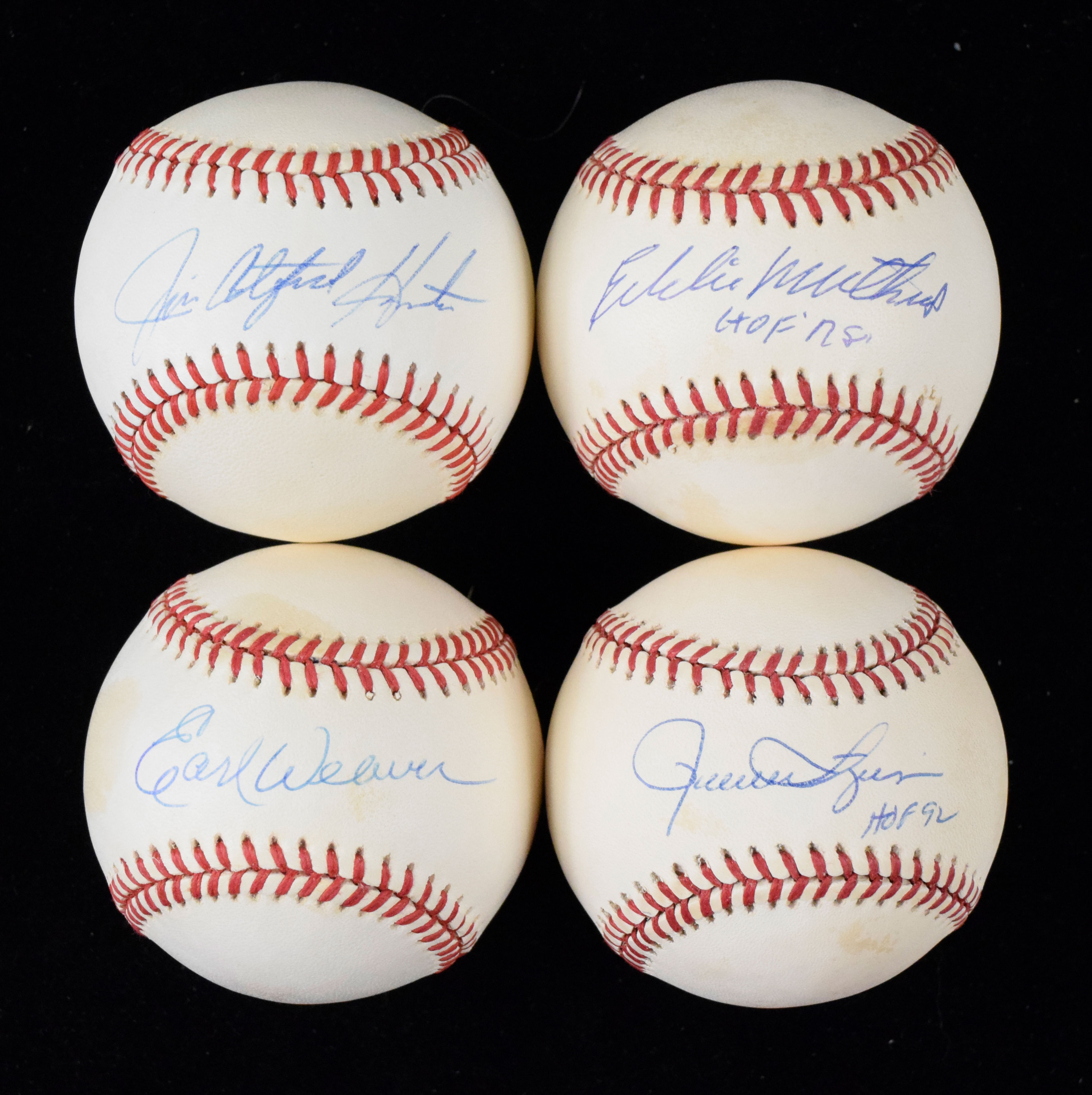 Description:Lot of (7) HOFers signed baseballs (EX-NM). Includes B.Brown AL ball (light toning) signed by Jim "Catfish" Hunter, B.Brown AL ball (toning) signed by Eddie Mathews with "HOF 78" inscription, B.Brown AL ball signed by Hoyt Wilhelm with "HOF 85" inscription, G.Budig AL ball (toning) signed by Rollie Fingers with "HOF 92" inscription, W.White NL ball (light toning) signed by Lee Smith, W.White NL ball (toning) signed by Sparky Anderson, and B.Brown AL ball (toning) signed by Earl Weaver. Signatures rate 7/8 to 9/10 out of 10: EX-NM