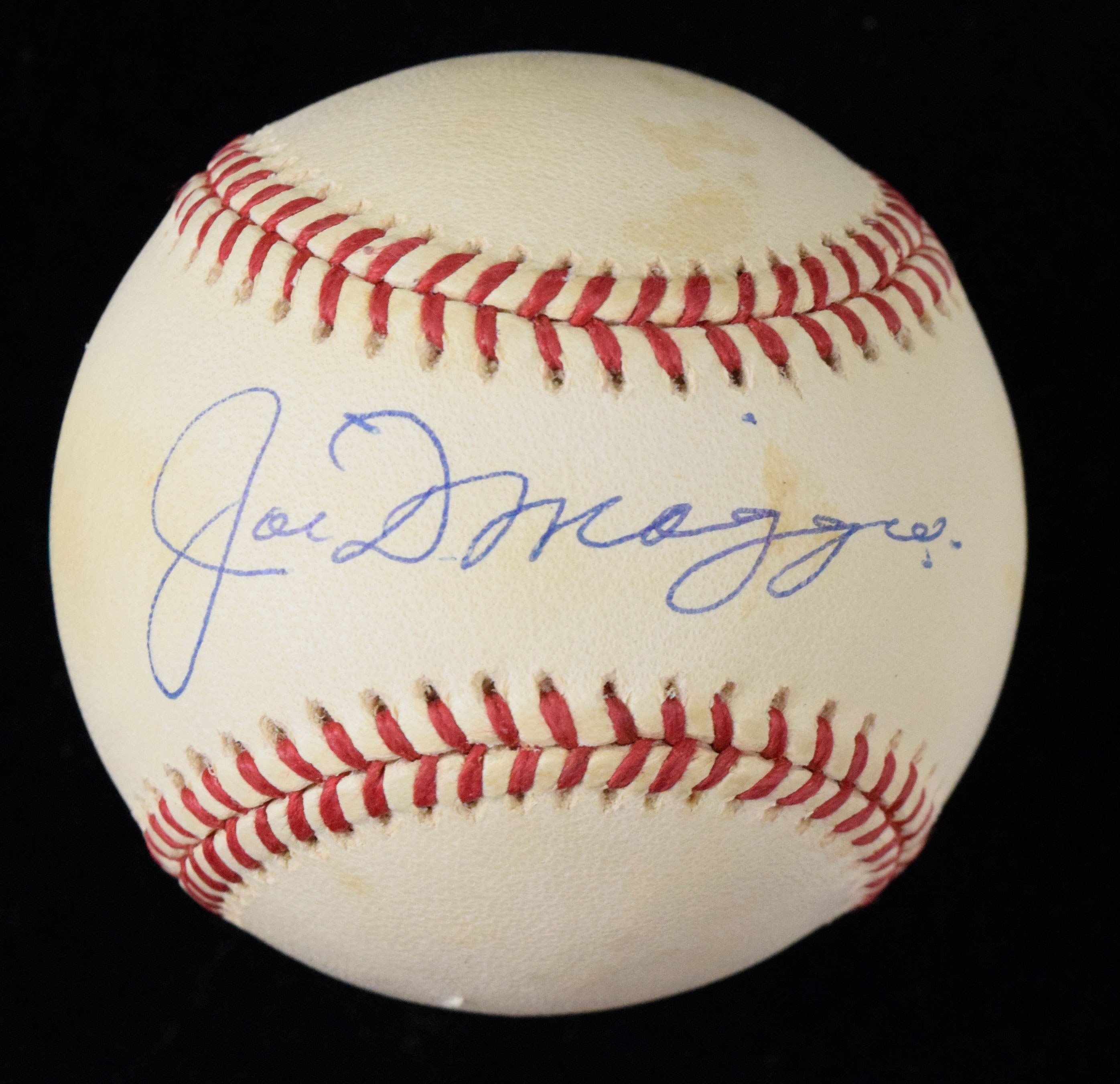 Description:Joe DiMaggio signed B.Brown AL baseball (EX). DiMaggio signed the sweet spot in blue ink. Signature rates 8/9 out of 10. Scattered areas of toning: EX