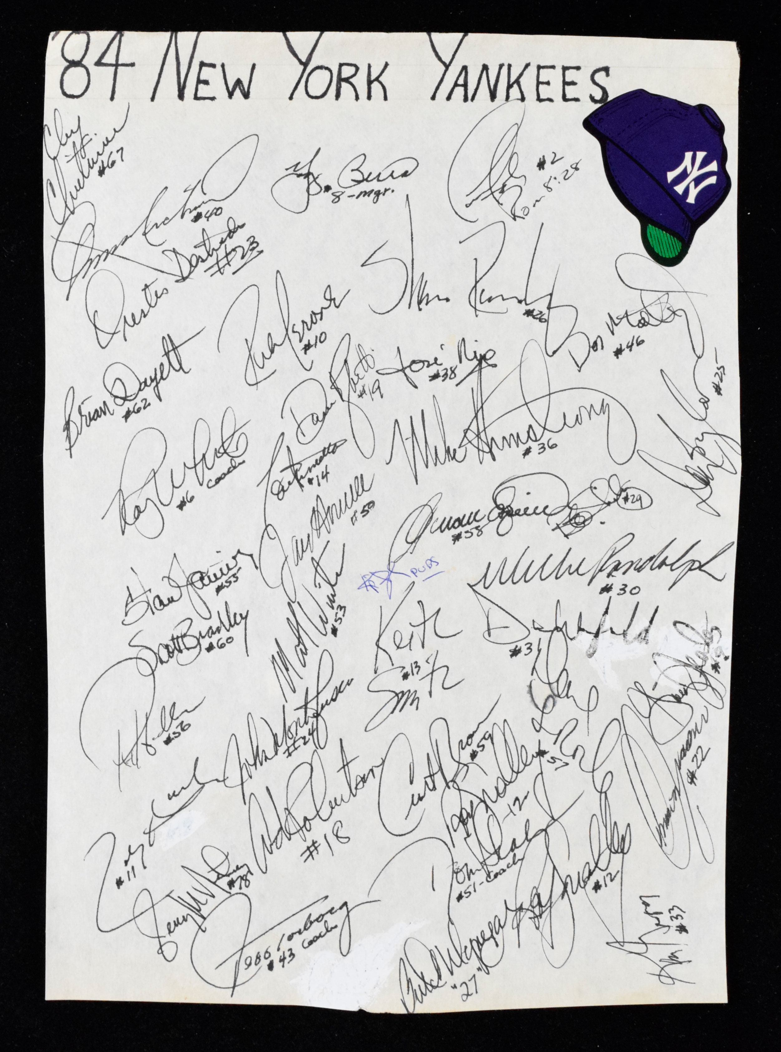 Description:1984 New York Yankees team signed autograph sheet (EX/MT). Approx. 8"x12" sheet signed by (37) members of the 1984 Yankees including Yogi Berra, Dave Winfield, Don Mattingly, Dave Righetti, Willie Randolph, Don Baylor, Jay Howell, Butch Wynegar, Bob Shirley, Mike Armstrong, Ken Griffey, Omar Moreno, Toby Harrah, Roy Smalley, Bryan Dayett, Tim Foli, Andre Robertson, Rick Cerone, Lou Piniella, and others. Signatures rate 6/7 to 10 (avg 8) out of 10: EX/MT 2100000332212