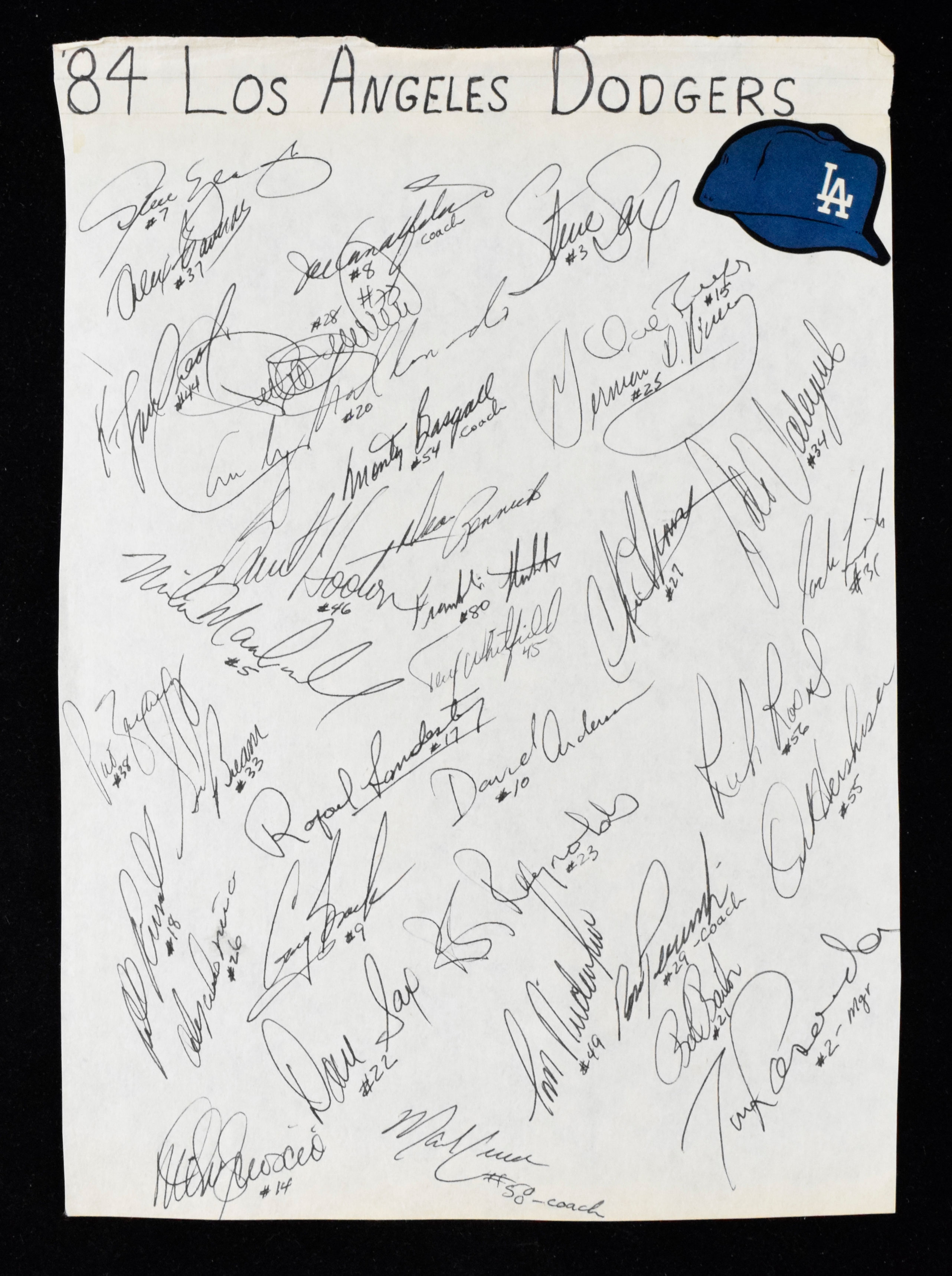 Description:1984 Los Angeles Dodgers team signed autograph sheet (EX/MT). Approx. 8.5"x12" sheet signed by (35) members of the 1984 Dodgers including Tom Lasorda, Orel Hershiser, Fernando Valenzuela, Mike Scioscia, Pedro Guerrero, Alejandro Pena, Dave Anderson, Greg Brock, Mike Marshall, Tom Niedenfuer, Burt Hooton, Steve Sax, Bob Bailor, Ken Landreaux, Candy Maldonado, German Rivera, Bill Russell, Terry Whitfield, and others. Signatures rate 7 to 10 (avg 8/9) out of 10: EX/MT 2100000336029