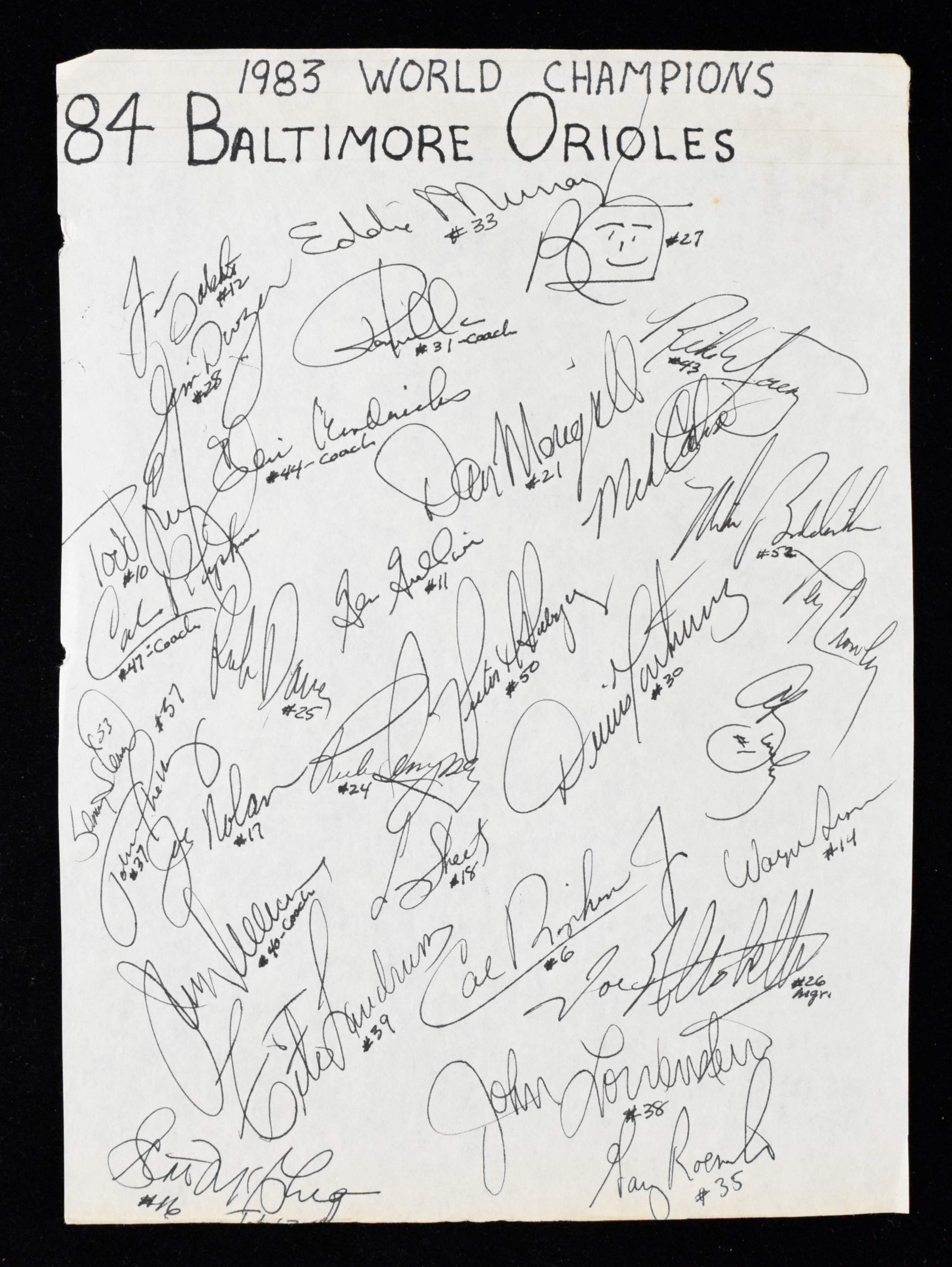 Description:1984 Baltimore Orioles team signed autograph sheet (EX/MT). Approx. 8.5"x12" sheet signed by (30) members of the 1984 Orioles including Joe Altobelli, Cal Ripken (Sr), Cal Ripken Jr, Eddie Murray, Mike Boddicker, Wayne Gross, Mike Young, Gary Roenicke, Scott McGregor, Rich Dauer, Rick Dempsey, Todd Cruz, Al Bumbry, John Shelby, John Lowenstein, Lenn Sakata, and others. Signatures rate 7 to 10 (avg 8/9) out of 10: EX/MT 2100000336036