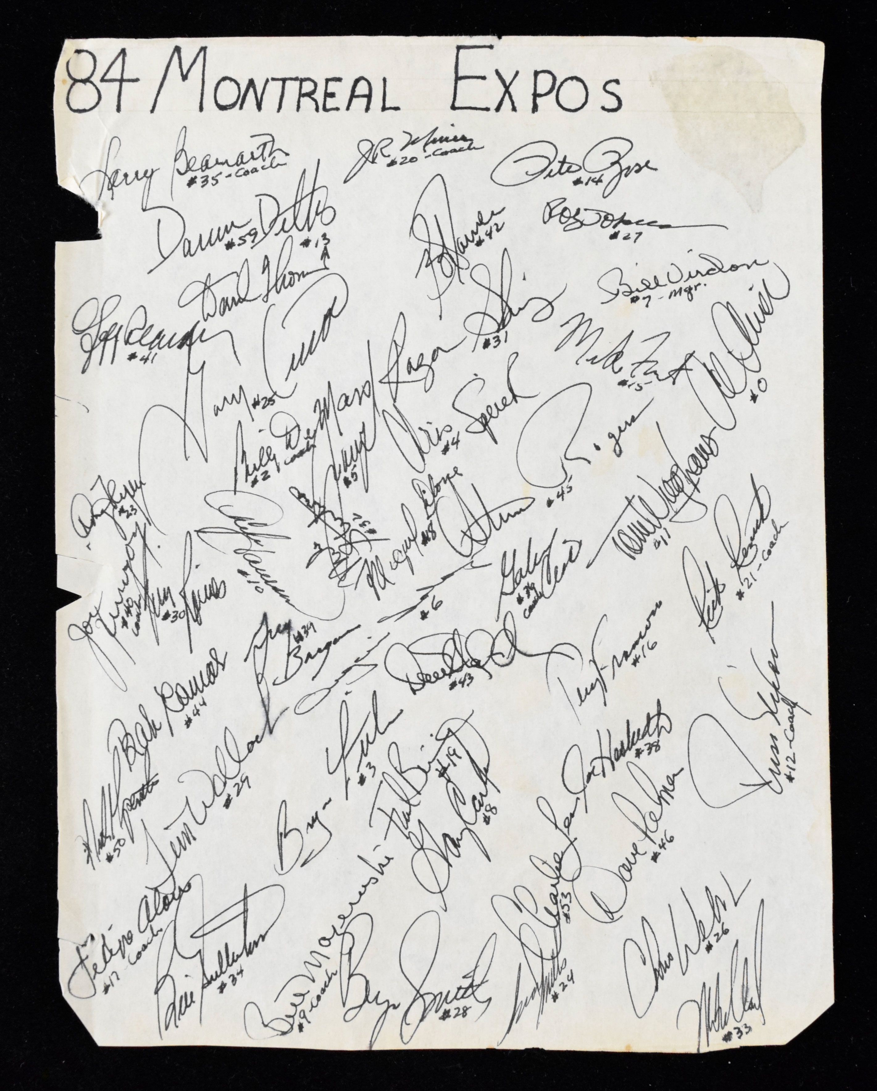 Description:1984 Montreal Expos team signed autograph sheet (EX). Approx. 9"x12" sheet signed by (47) members of the 1984 Expos including Bill Virdon, Bill Mazeroski, Gary Carter, Tim Raines, Andre Dawson, Pete Rose, Tim Wallach, Terry Francona, Al Oliver, Dan Schatzeder, Charlie Lea, Bryn Smith, Miguel Dilone, Jim Wohlford, Joe Hesketh, Bill Gullickson, Doug Flynn, Derrel Thomas, Bryan Little, Mike Stenhouse, Argenis Salazar, Jeff Reardon, and others. Signatures rate 6/7 to 10 (avg 8) out of 10. Light stains, and wear along the left edge: EX 2100000336043