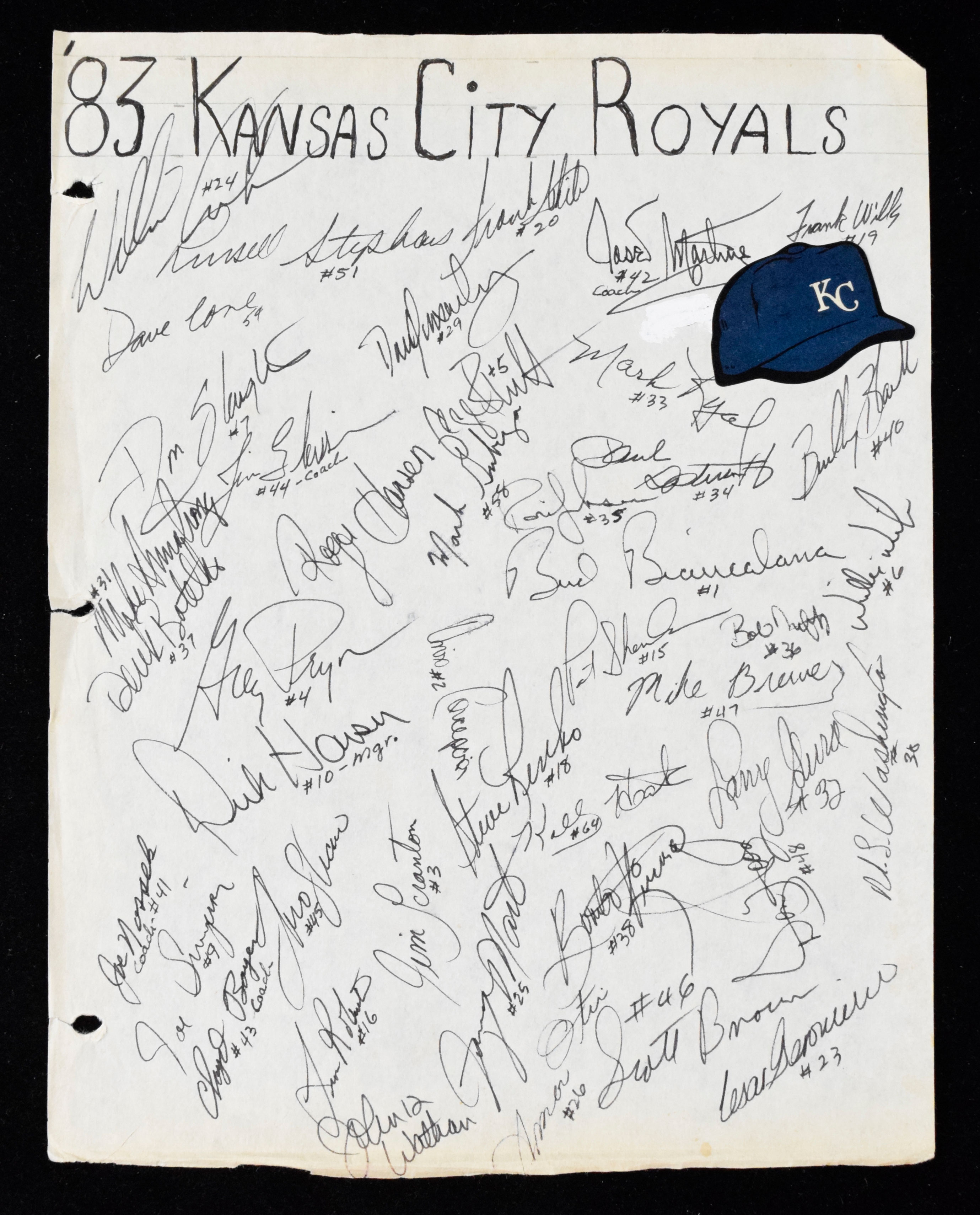 Description:1983 Kansas City Royals team signed autograph sheet (EX). Approx. 9"x11.5" sheet signed by (42) members of the 1983 Royals including Dick Howser, George Brett, Dan Quisenberry, Bud Black, Willie Aikens, Paul Splittorff, Willie Wilson, Frank White, Steve Renko, Pat Sheridan, Don Slaught, U.L. Washington, John Wathan, Amos Otis, Joe Simpson, Leon Roberts, Onix Concepcion, Greg Pryor, Cesar Geronimo, Larry Gura, Dave Cone, and others. Signatures rate 6/7 to 10 (avg 8) out of 10. Wear along the edges: EX 2100000336050