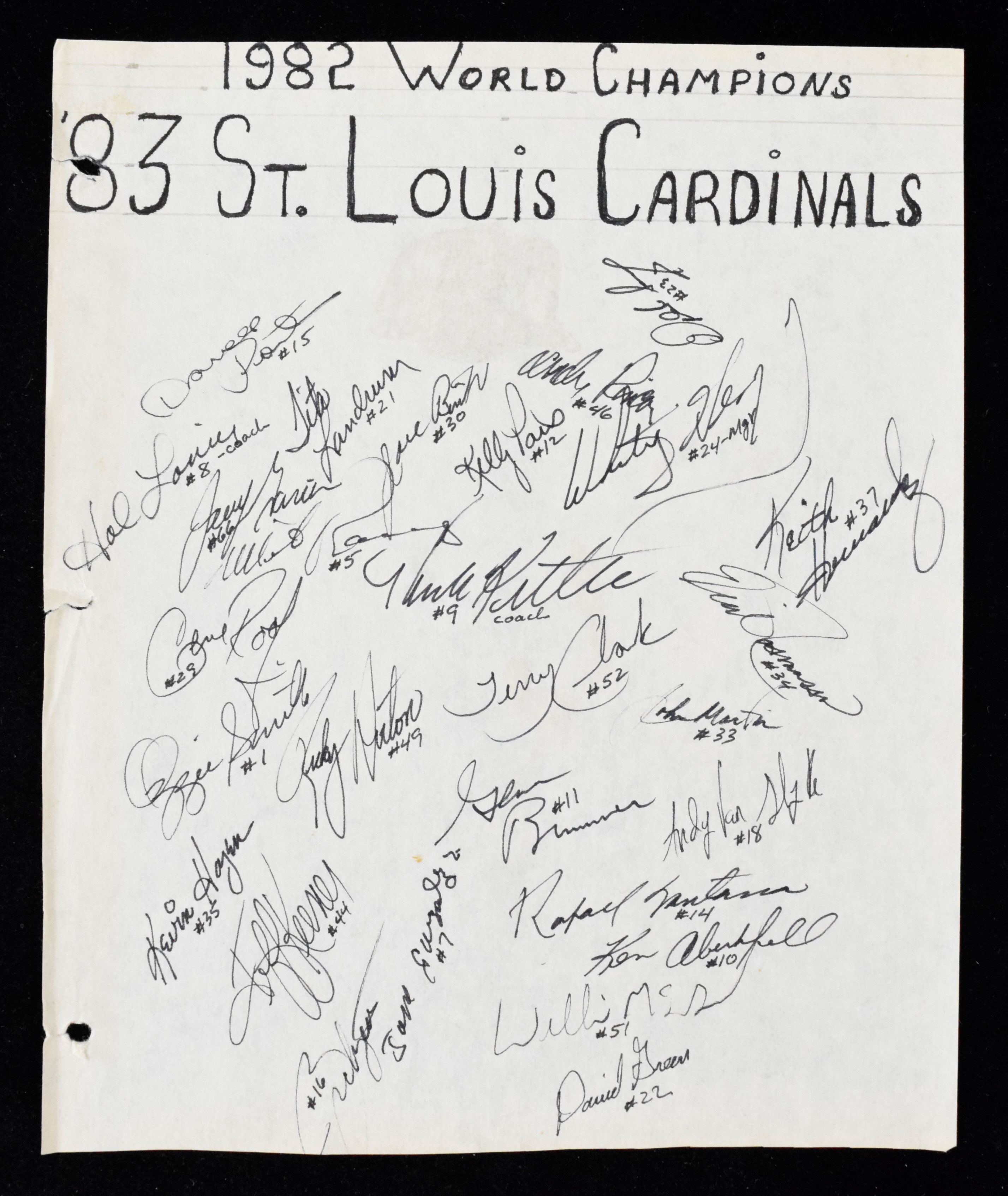 Description:1983 St. Louis Cardinals team signed autograph sheet (EX). Approx. 9"x11" sheet signed by (28) members of the 1983 Cardinals including Whitey Herzog, Ozzie Smith, Darrell Porter, Willie McGee, Keith Hernandez, Ken Oberkfell, Andy Van Slyke, David Green, John Martin, Mike Ramsey, Glenn Brummer, Rafael Santana, Kevin Hagen, Tito Landrum, and others. Signatures rate 6/7 to 10 (avg 8) out of 10. Light stains, and wear along the left edge: EX 2100000336067