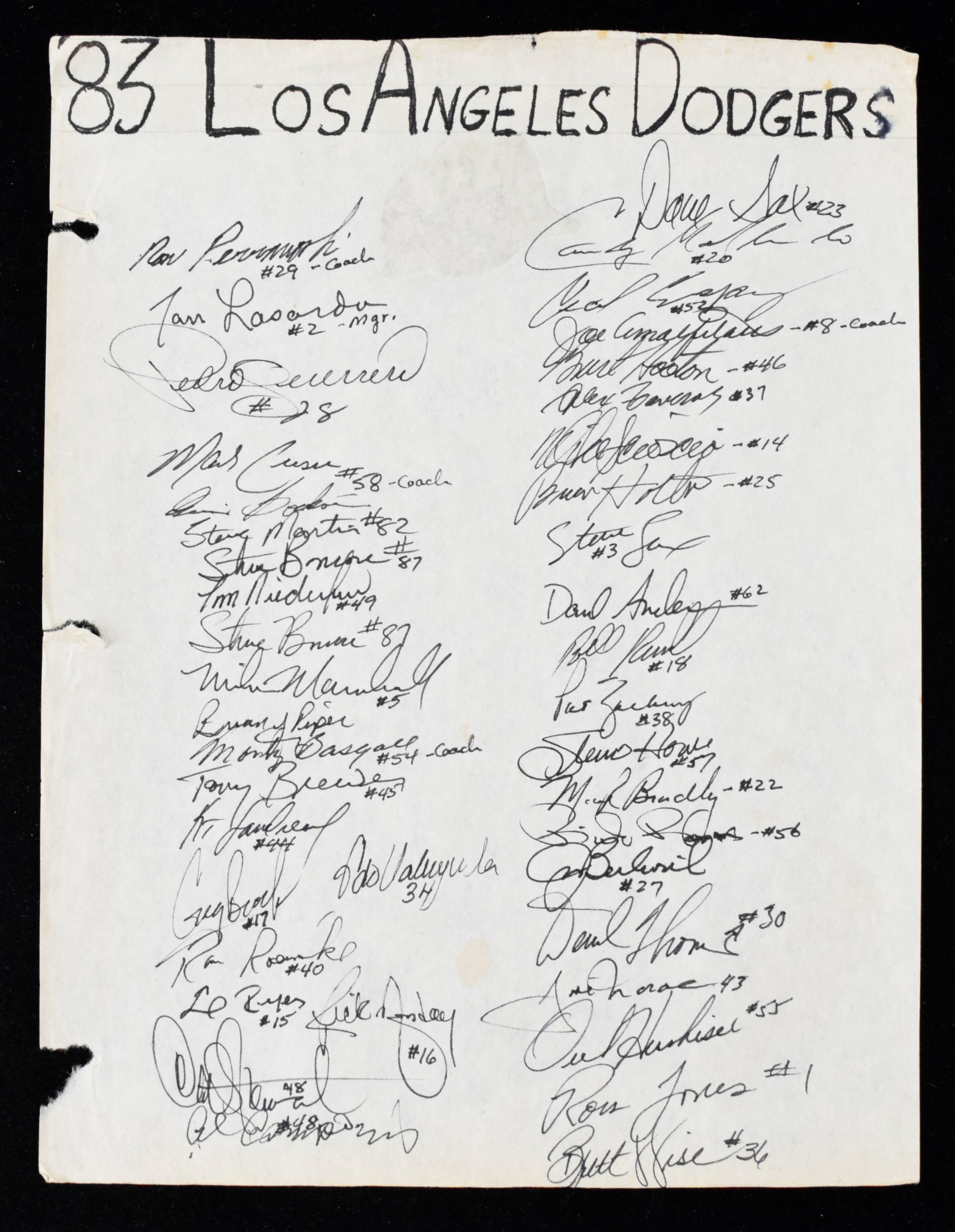 Description:1983 Los Angeles Dodgers team signed autograph sheet (EX). Approx. 9"x12" sheet signed by (38) members of the 1983 National League West champion Dodgers including Tom Lasorda, Pedro Guerrero, Fernando Valenzuela, Tom Niedenfuer, Ken Landreaux, Steve Howe, Orel Hershiser, Bill Russell, Steve Sax, Dave Stewart, Greg Brock, Mike Marshall, Derrel Thomas, Rick Monday, Ron Roenicke, Dave Anderson, Jose Morales, Joe Beckwith, Candy Maldonado, Pat Zachry, Mike Scioscia, and others. Signatures rate 7 to 10 (avg 8/9) out of 10. Light stain, and wear along the edges: EX 2100000336081
