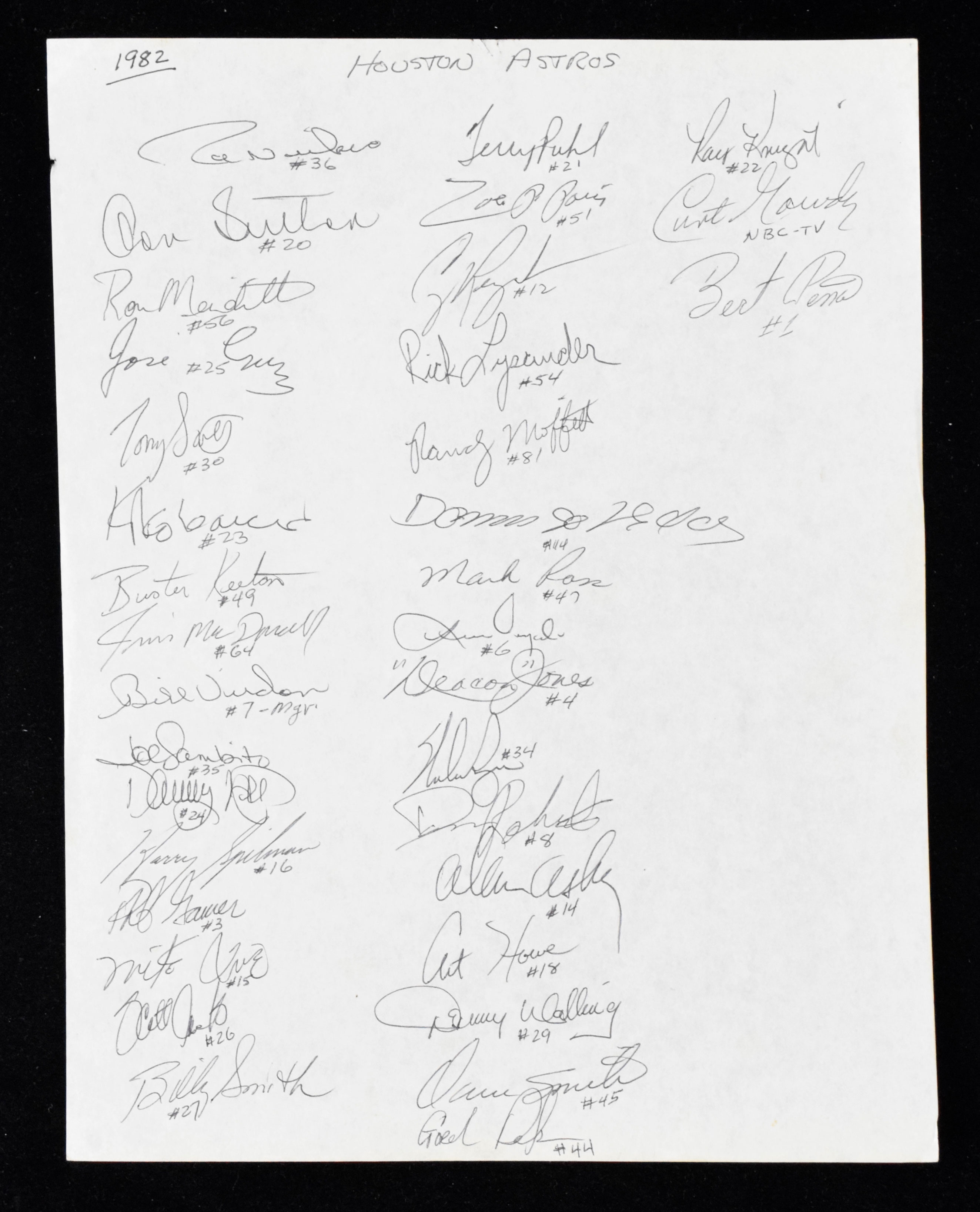 Description:1982 Houston Astros team signed autograph sheet (EX/MT). Approx. 8.5"x11" sheet signed by (34) members of the 1982 Astros including NBC broadcaster Curt Gowdy, Bill Virdon, Don Sutton, Nolan Ryan, Joe Niekro, Phil Garner, Ray Knight, Jose Cruz, Art Howe, Terry Puhl, Alan Ashby, Joe Sambito, Tony Scott, Denny Walling, Danny Heep, Luis Pujols, Craig Reynolds, and others. Signatures rate 8 to 10 out of 10: EX/MT 2100000336128