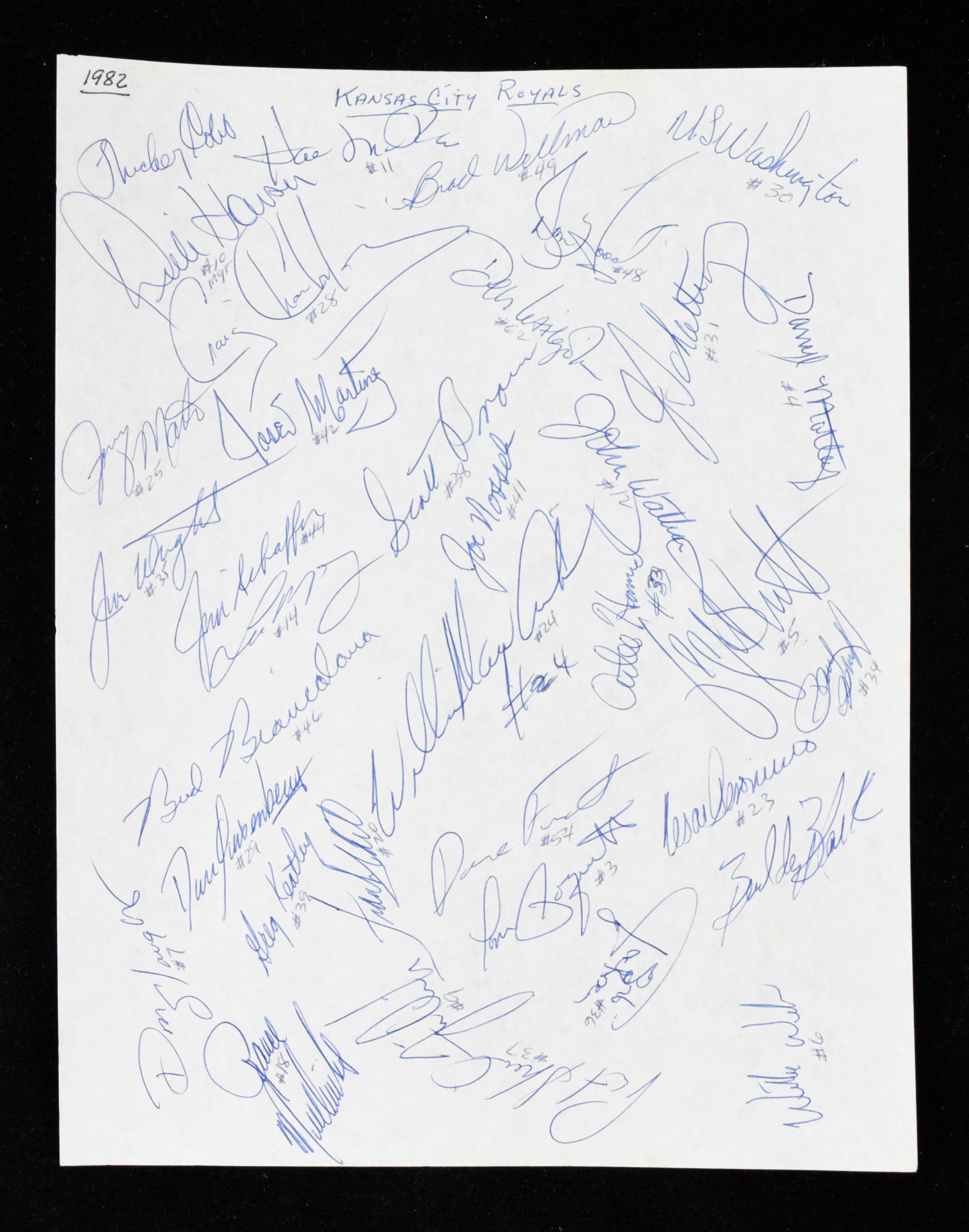 Description:1982 Kansas City Royals team signed autograph sheet (NM). Approx. 8.5"x11" sheet signed by (34) members of the 1982 Royals including Dick Howser, George Brett, Willie Wilson, Hal McRae, Frank White, Dan Quisenberry, U.L. Washington, John Wathan, Jerry Martin, Willie Aikens, Paul Splittorff, Cesar Geronimo, Don Slaught, Lee May, Jamie Quirk, Don Hood, Tom Poquette, Atlee Hammaker, and others. Signatures 8 to 10 out of 10: NM 2100000336180