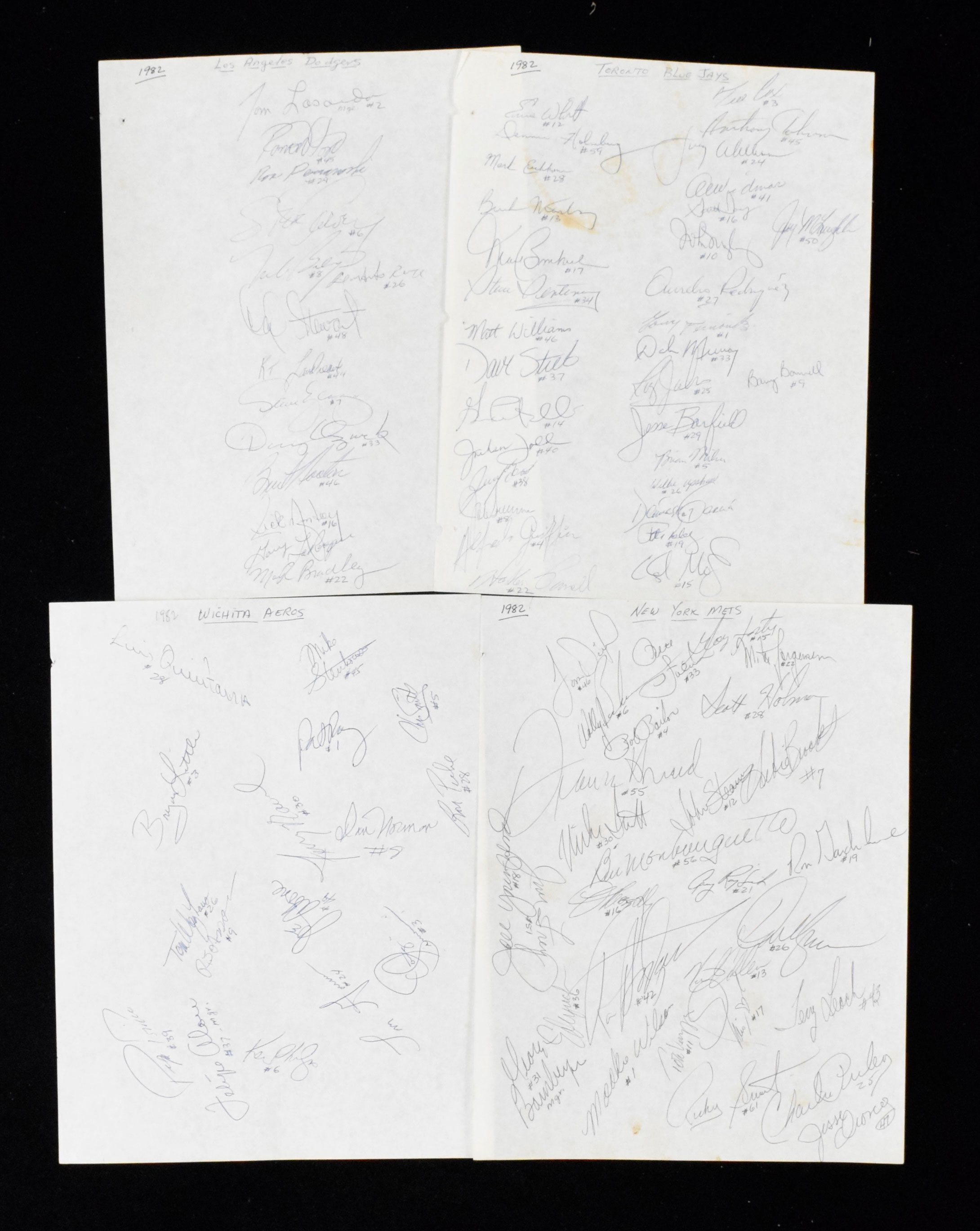 Description:1982 Los Angeles Dodgers, New York Mets, Toronto Blue Jays, Wichita Aeros team signed autograph sheets (VG/EX-NM). Includes 8.5"x11" sheet signed by (14) members of the 1982 Dodgers: Tom Lasorda, Steve Garvey, Ken Landreaux, Rick Monday, Steve Yeager, Mark Belanger, Dave Stewart, and others (EX/MT-NM); 8.5"x11" sheet signed by (29) members of the 1982 Mets: George Bamberger, George Foster, John Stearns, Jesse Orosco, Ed Lynch, Neil Allen, Hubie Brooks, Dave Kingman, Bob Bailor, Mookie Wilson, Pete Falcone, Ron Hodges, Wally Backman, Scott Holman, Terry Leach, and others (EX); 8.5"x11" sheet signed by (33) members of the 1982 Blue Jays: Bobby Cox, Dave Stieb, Tony Fernandez, Damaso Garcia, Roy Lee Jackson, Dale Murray, Buck Martinez, Joey McLaughlin, Willie Upshaw, Jim Gott, Jesse Barfield, Garth Iorg, Ernie Whitt, Alfredo Griffin, and others (VG/EX-EX); 8.5"x11" sheet signed by (16) members of the 1982 Wichita Aeros: Felipe Alou, Pepe Frias, Tom Gorman, Roy Johnson, Bryan Little, Jerry Manuel, Dan Norman, Ken Phelps, Luis Quintana, Pat Rooney, Chris Smith, Mike Stenhouse, Tom Wieghaus, and others (EX/MT-NM). Signatures rate 6/7 to 10 (avg 8/9) out of 10: VG/EX-NM 2100000336197