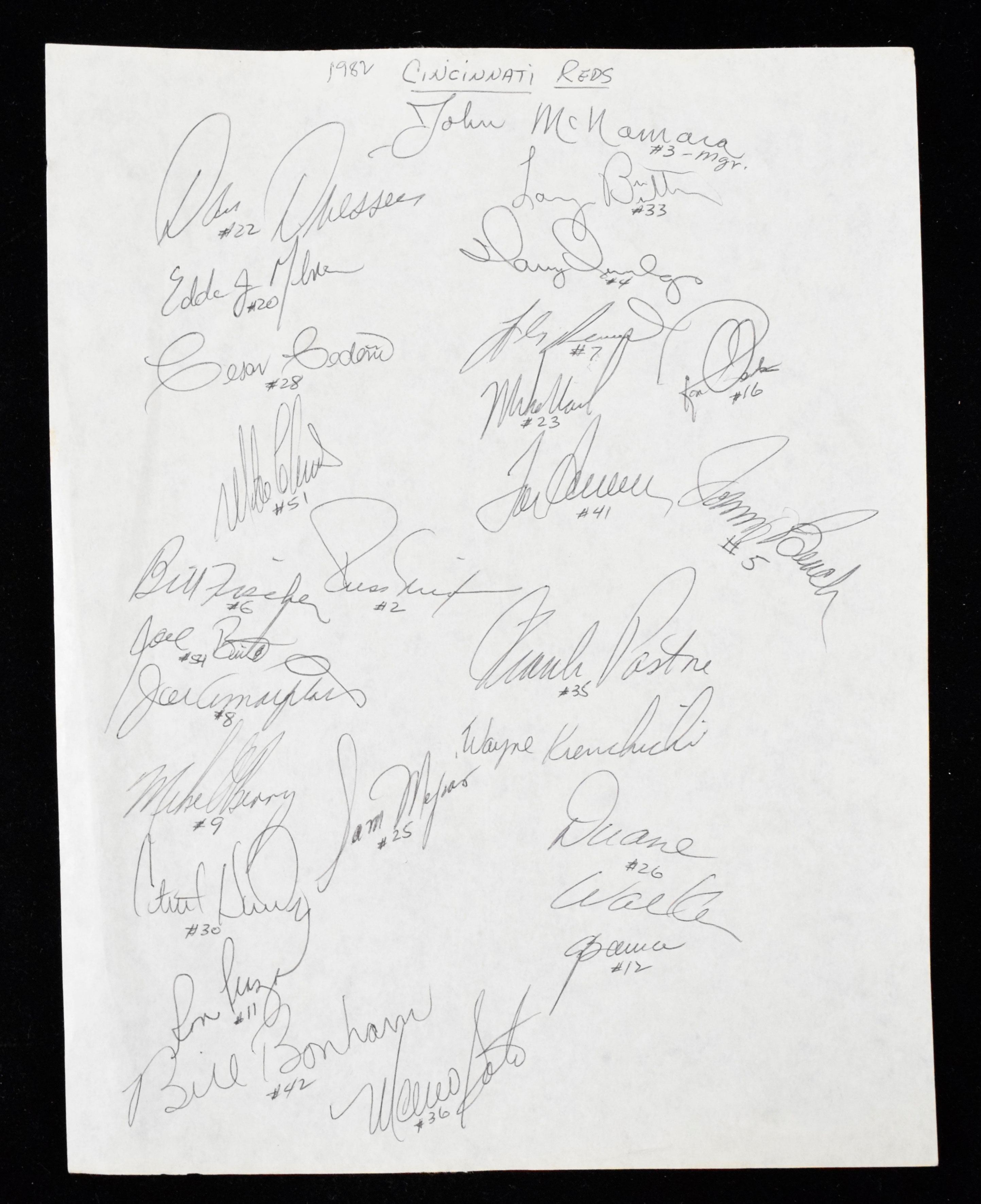 Description:1982 Cincinnati Reds team signed autograph sheet (NM). Approx. 8.5"x11" sheet signed by (26) members of the 1982 Reds including John McNamara, Tom Seaver, Johnny Bench, Mario Soto, Cesar Cedeno, Frank Pastore, Dan Driessen, Eddie Milner, Larry Biittner, Ron Oester, Wayne Krenchicki, Duane Walker, Mike Vail, and others. Signatures rate 8 to 10 out of 10: NM 2100000336241