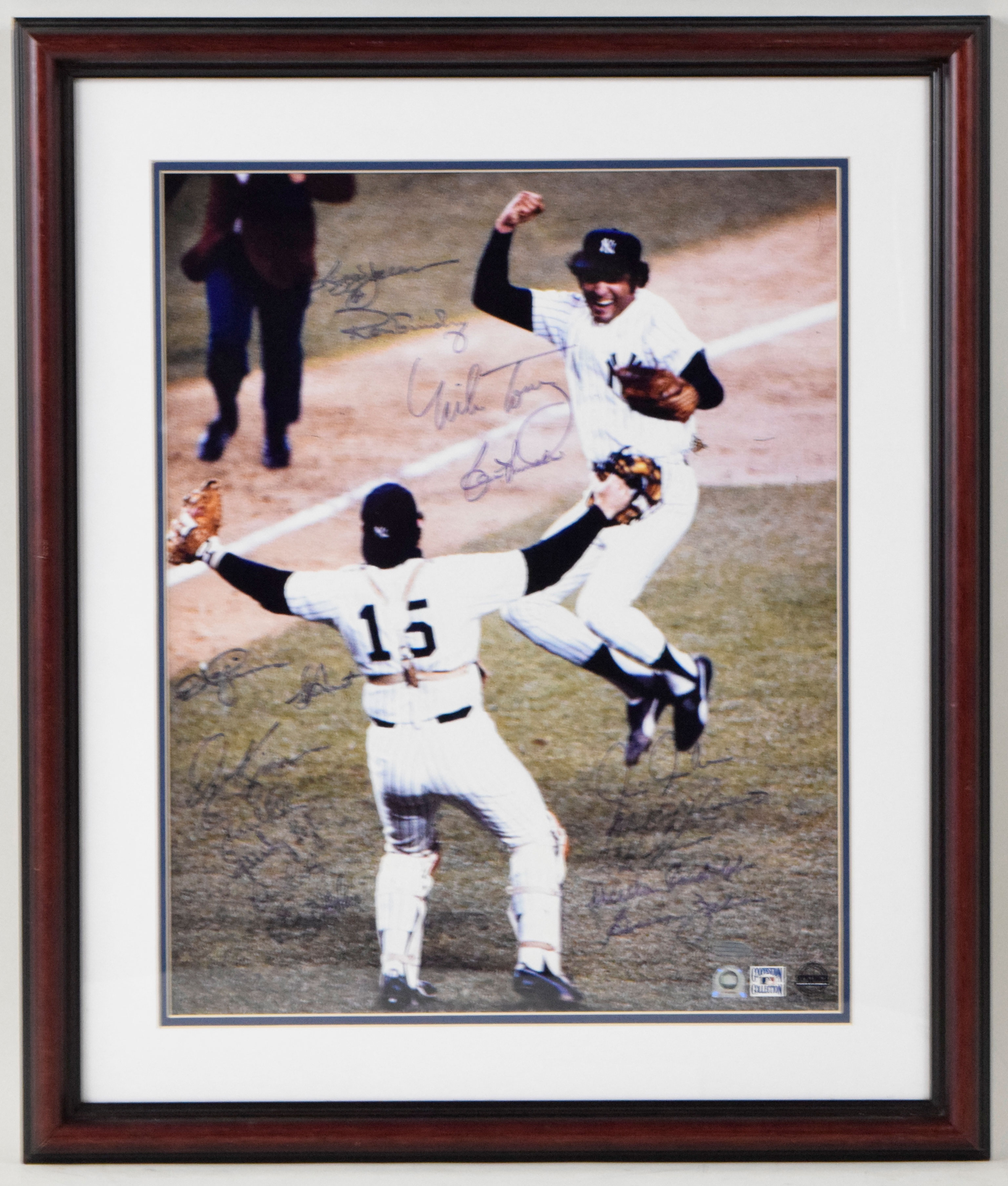 Description:1977 New York Yankees team signed oversize framed photo - MLB Authenticated (NM). Frame measures approx. 22.5"x26.5". Signed by (16) members of the 1977 World Series champion Yankees including Reggie Jackson, Graig Nettles, Mickey Rivers, Ron Guidry, Willie Randolph, Roy White, Sparky Lyle, Ed Figueroa, Bucky Dent, Chris Chambliss, Mike Torrez, Lou Piniella, Dave Kingman, Paul Blair, Cliff Johnson, and George Zeber. Signatures rate 6/7 to 8 out of 10 due to fading. Includes a previous auction LOA from PSA/DNA, and MLB Authenticated serial #ed hologram sticker is on the photo. Due to framing, complete condition is unknown: NM appearance