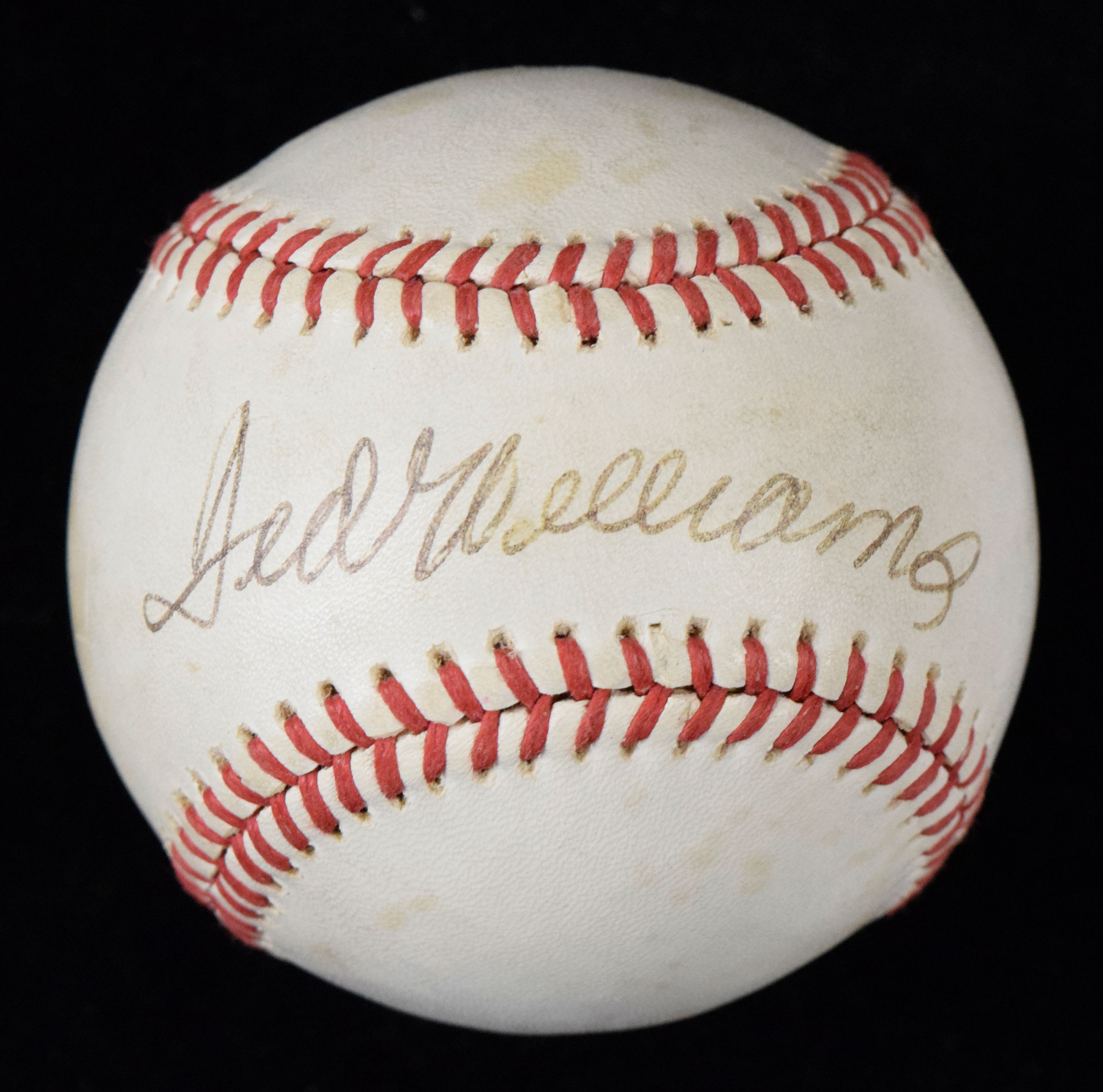 Description:Ted Williams signed B.Brown AL baseball (VG/EX). Williams signed the sweet spot in black ink. Signature rates 7 out of 10. Scattered areas of toning on all panels: VG/EX