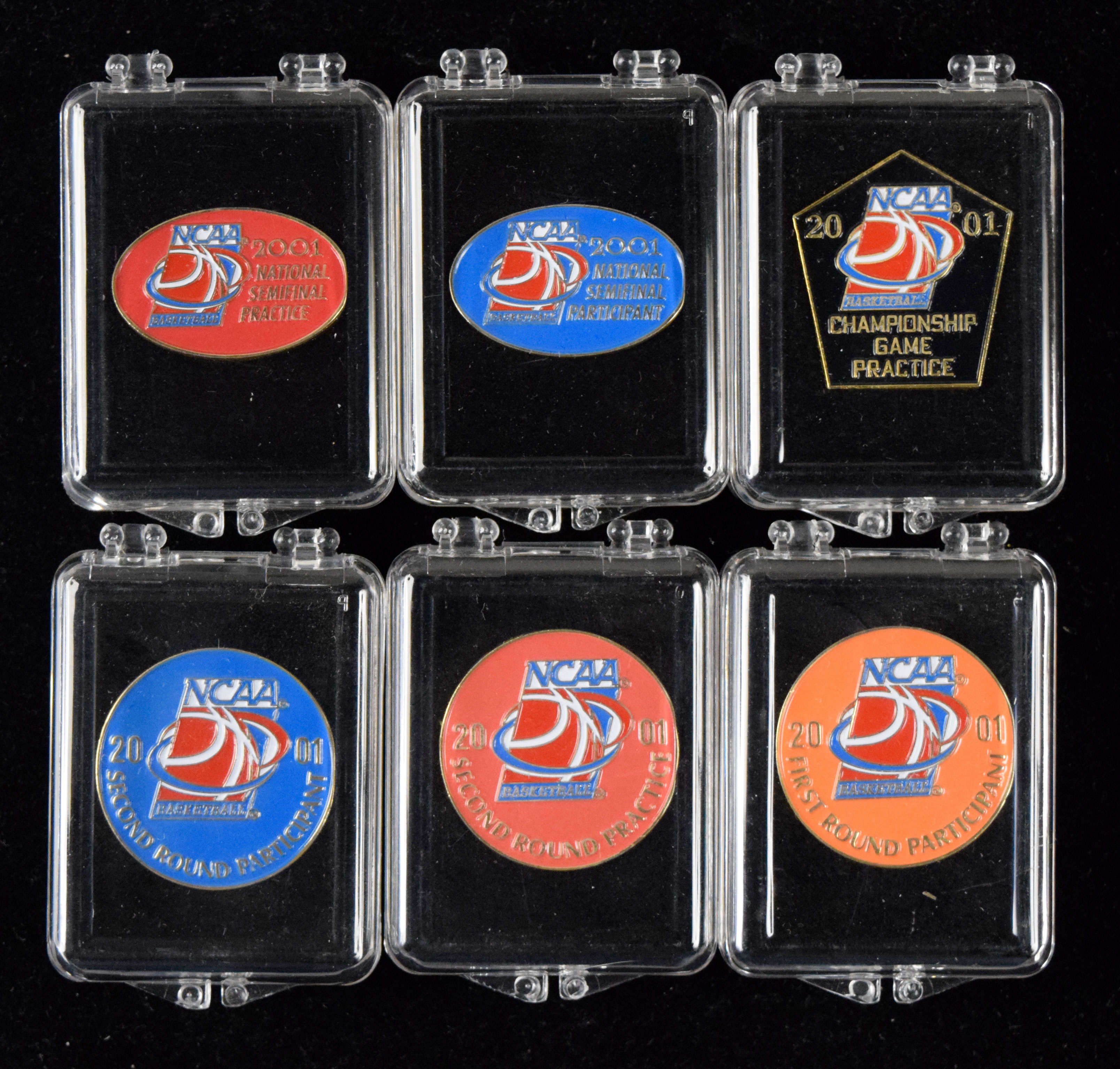 Description:Lot of (20) NCAA Tournament pins from 2001-2002 (NM-NM/MT overall). Includes 2001 opening round participant, 2001 first round participant, 2001 first round practice, 2001 second round participant, 2001 second round practice, 2001 regional semifinal participant, 2001 regional semifinal practice, 2001 regional final participant, 2001 regional final practice, 2001 Final Four participant, 2001 Final Four practice, 2001 Championship Game participant, 2001 Championship Game practice, 2002 opening round participant, 2002 opening round practice, 2002 first round participant, 2002 first round practice, 2002 second round participant, 2002 second round practice, and 2002 regional semifinal practice: NM-NM/MT overall