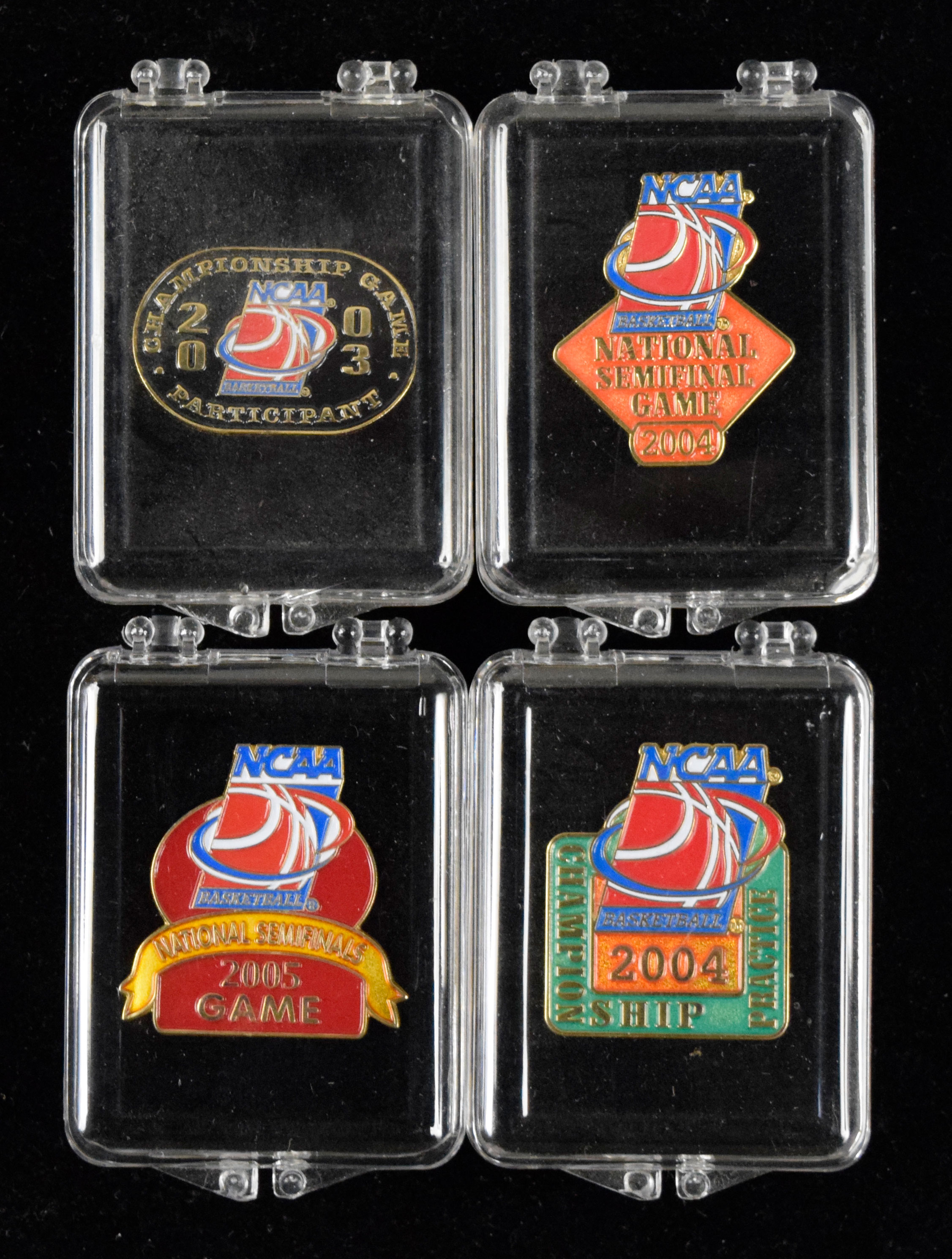 Description:Lot of (20) NCAA Tournament pins from 2003-2005 (NM-NM/MT overall). Includes 2003 Championship Game participant, 2004 opening round practice, 2004 opening round game, 2004 first round practice, 2004 first round game, 2004 second round practice, 2004 second round game, 2004 regional semifinal practice, 2004 regional semifinal game, 2004 regional final practice, 2004 regional final game, 2004 Final Four practice, 2004 Final Four Game, 2004 National Championship practice, 2004 Championship Game, 2005 opening round practice, 2005 opening round game, 2005 first round practice, 2005 first round game, and 2005 Final Four Game: NM-NM/MT overall