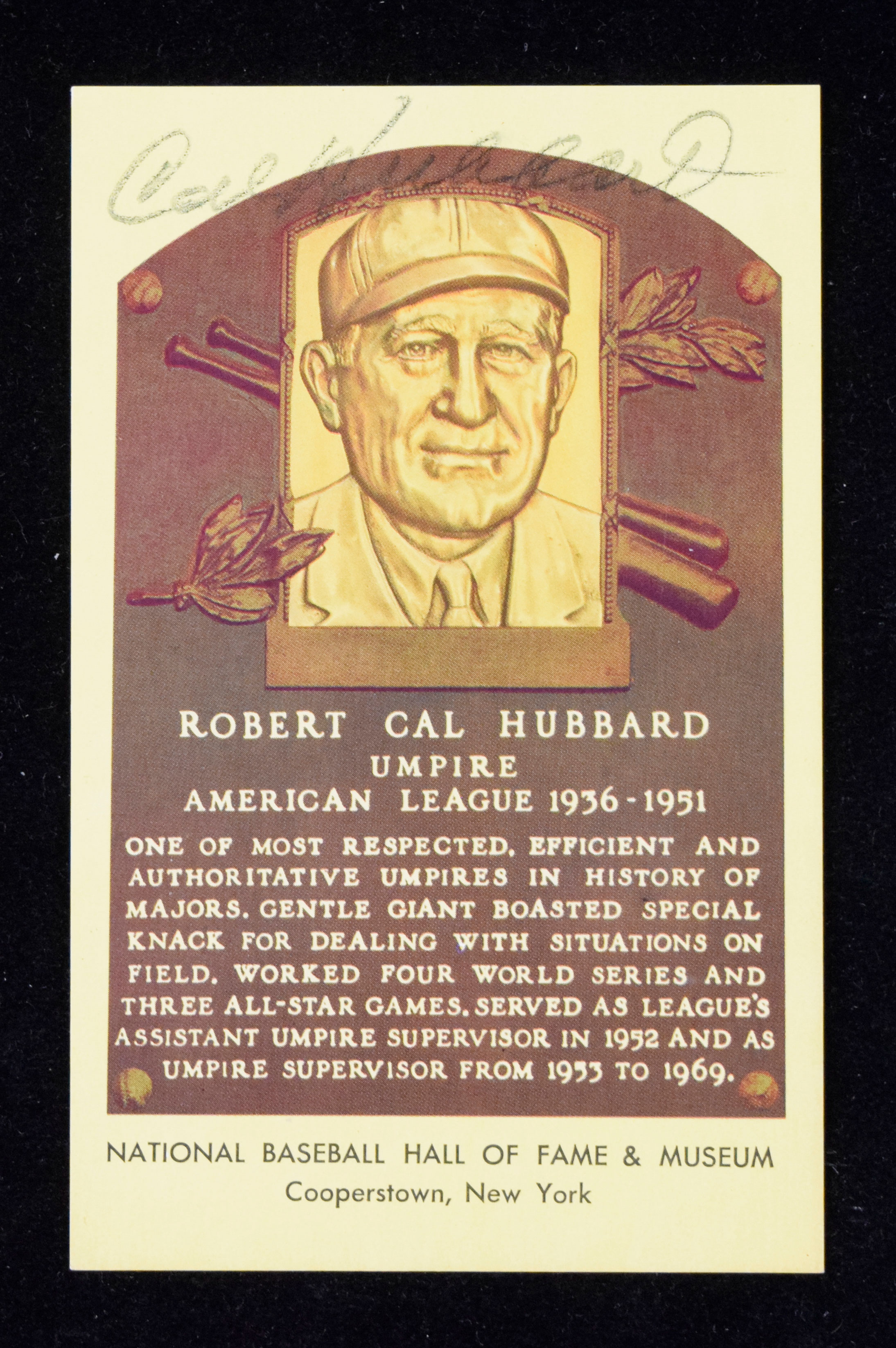 Cal Hubbard autographed yellow Hall of Fame postcard (EX) Signed in marker rating 6/7-7 out of 10. Pencil mark on back: EX