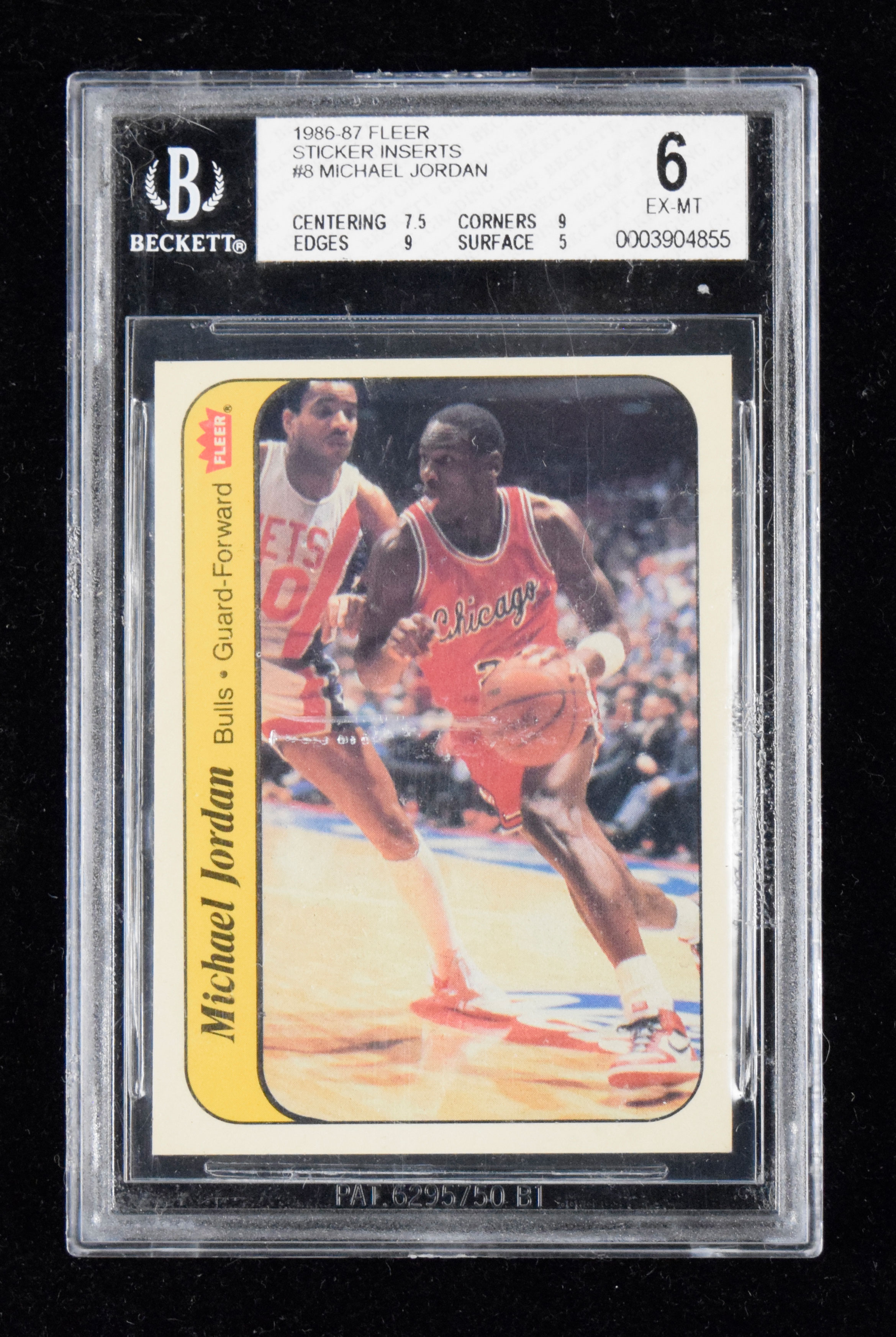 Description:1986-87 Fleer Stickers complete set (11 cards) with BGS "6" graded Michael Jordan (Avg. EX/MT) Key card #8 Michael Jordan has been graded EX-MT 6 by BVG (some wear to case). Balance are mostly EX/MT-NM with some centering issues and the usual wax residue on backs. The Dantley card grades lesser with ding on top edge: Avg. EX/MT ($750-$1,250)