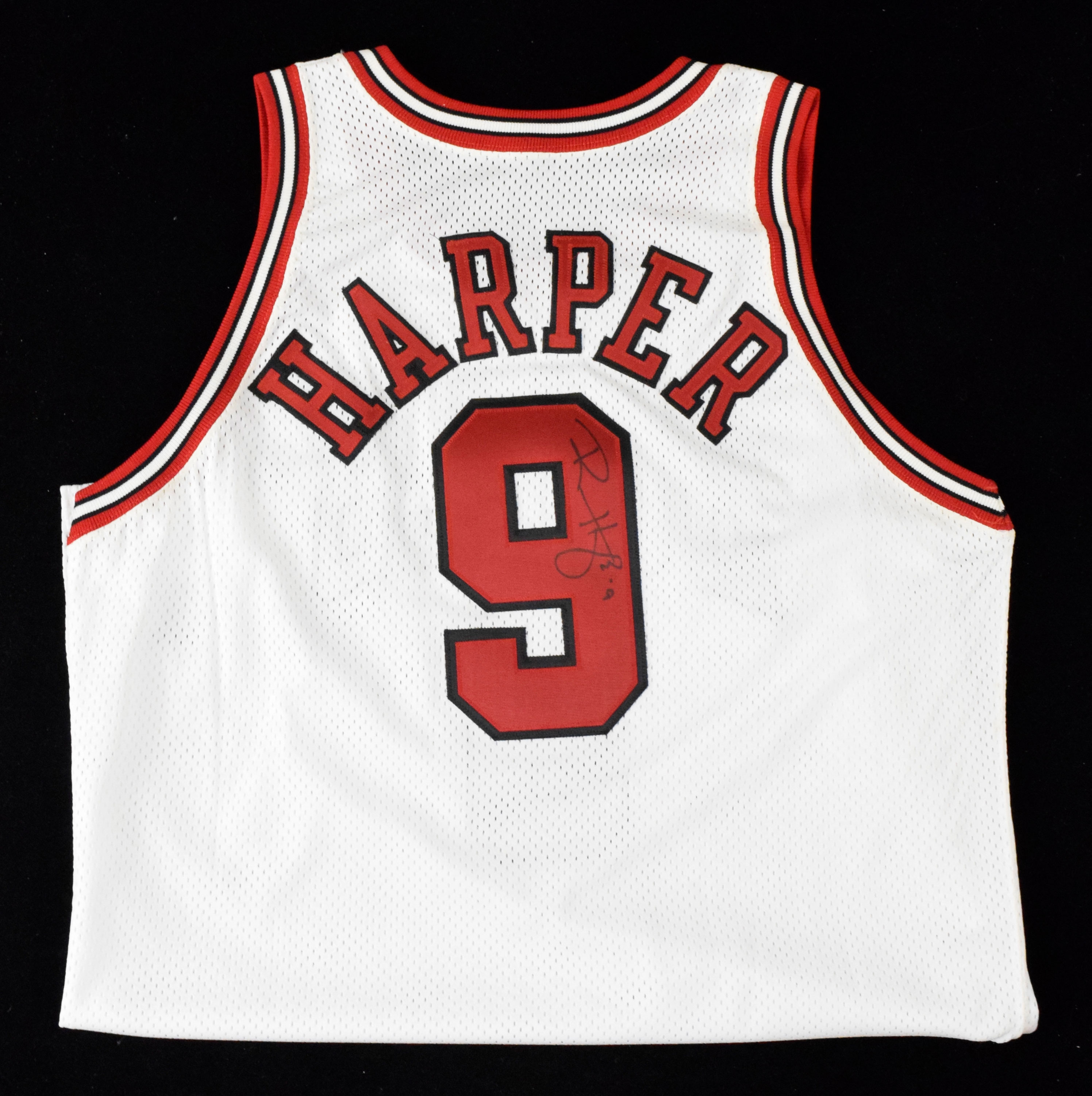 Description:1996-97 Ron Harper autographed Chicago Bulls jersey - professional quality (EX/MT) White mesh jersey has "Bulls" team name across the front with number "9" below. Number also appears on back along with the name, "Harper." Champion tag on the left front tail notes size (48) and is next to the "Designed & Tailored Exclusively for Chicago Bulls" year tag ("96 97") which also reads "Body Length +4." Signed on the back number in marker rating 8 out of 10. Light wear with some minor scattered soiling. While the jersey appears to be tagged in similar manner to those which were issued to players/team we are unaware if this particular jersey was intended for Rodman: EX/MT