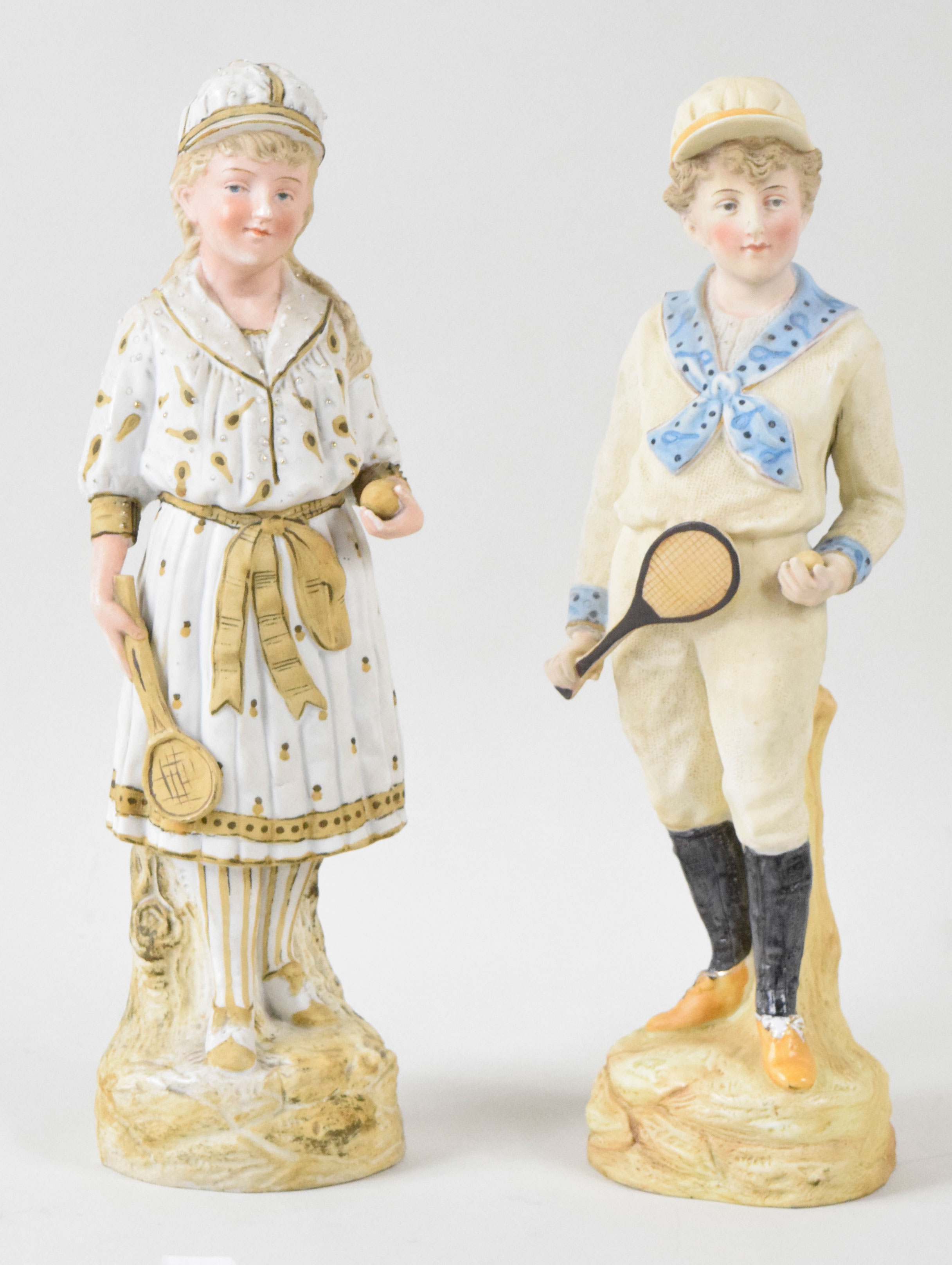 Description:Pair of vintage German bisque porcelain tennis player figurines, c.early 1900s (EX-EX/MT) Both measure approx. 14" tall with just a touch of light evident wear: EX-EX/MT