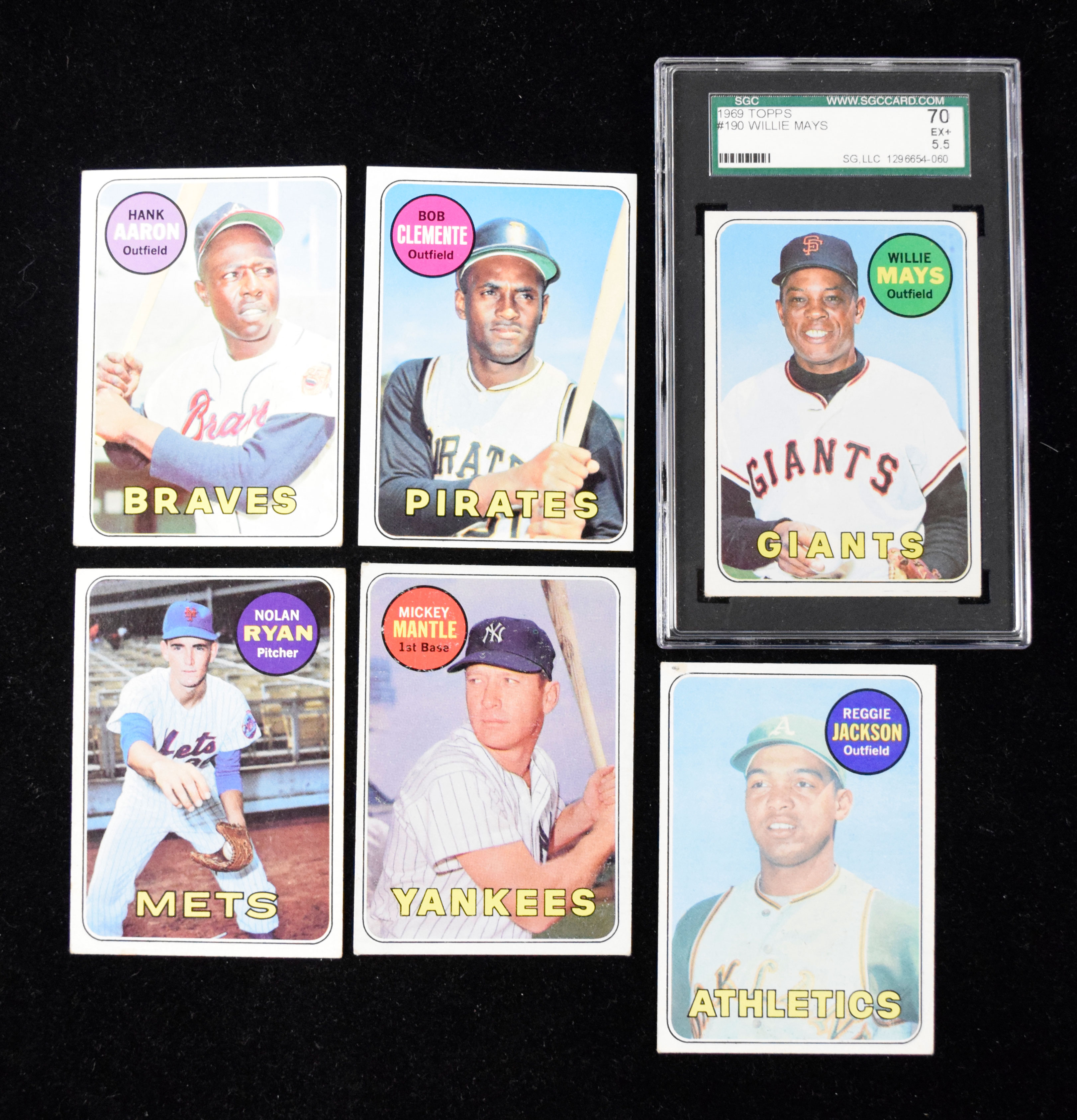 1969 Topps Baseball complete set (664 cards) (Avg. VG-VG/EX) Average VG-VG/EX condition throughout with GD to EX-EX/MT general range. It appears that a handful of cards have likely been trimmed. Keys: #20 Banks (EX OC), 50 Clemente (EX/MT-NM OC), 85 Brock (GD/VG), 95 Bench (VG), 100 Aaron (GD), 120 Rose (VG/EX), 130 Yastrzemski (likely trimmed), 190 Mays (SGC EX+ 5.5), 200 Gibson (likely trimmed), 260 Jackson (GD), 410 Kaline (VG), 480 Seaver (EX OC), 500 Mantle (VG), 510 Carew (EX/MT OC), 533 Ryan (VG/EX), and 597 Fingers (VG): Avg. VG-VG/EX ($1,000-$2,000)