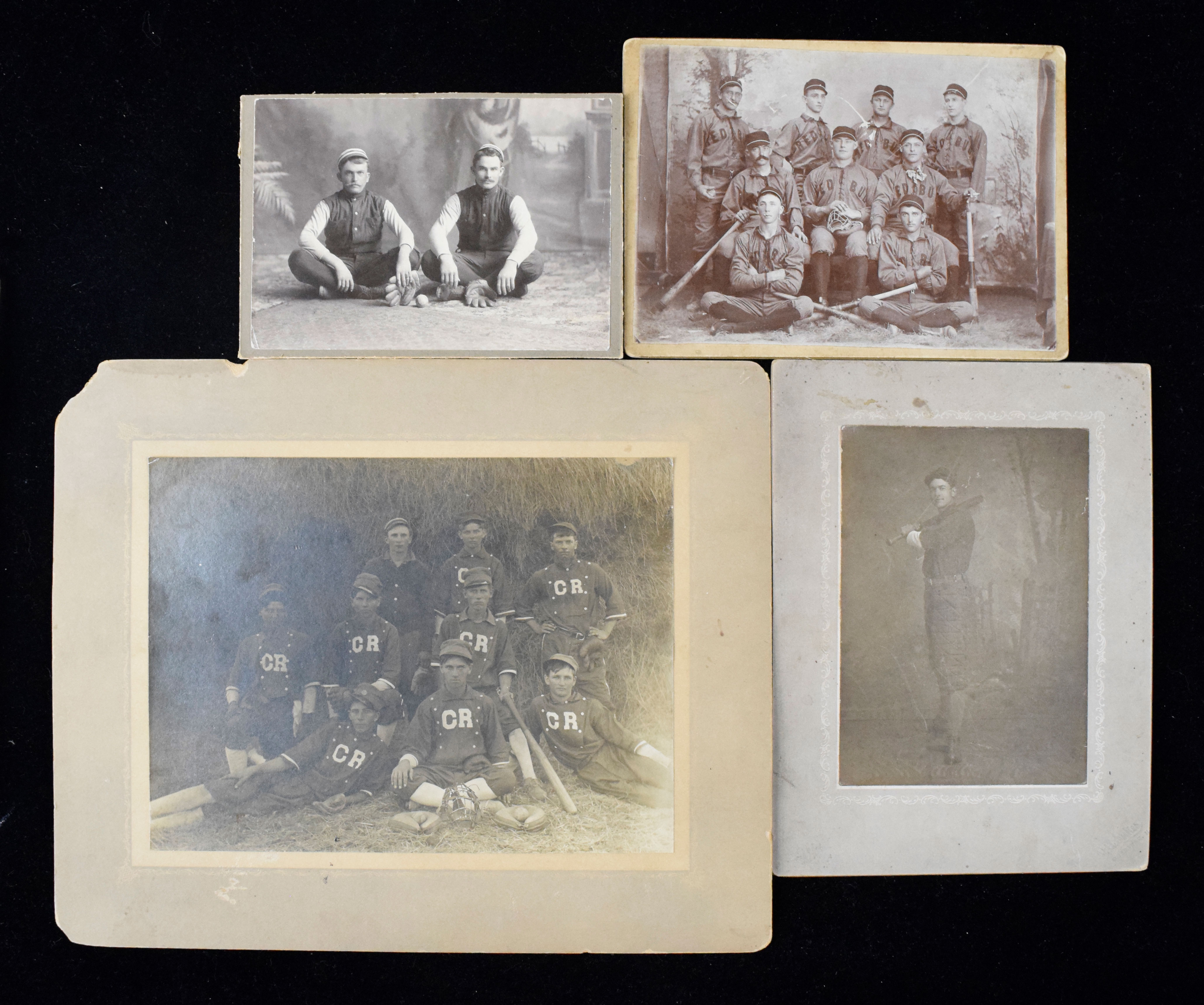 Description:Nice lot of (4) early baseball team/player photographs c.1880s-90s (GD-EX) Includes c.1880s-90s team photo showing members in "Red Bud" uniforms which is on 5"x7" mount (mild toning and light wear); sepia toned photo (on approx. 4"x6" mount) showing a pair of uniformed players with crescent pad gloves (light toning with some edge wear to image); cabinet photo (6"8") of uniformed player in quilted pants (toning and light general wear); cabinet mounted photo (11"x9") showing players in bib front uniforms (toning, some chipping to mount): GD-EX