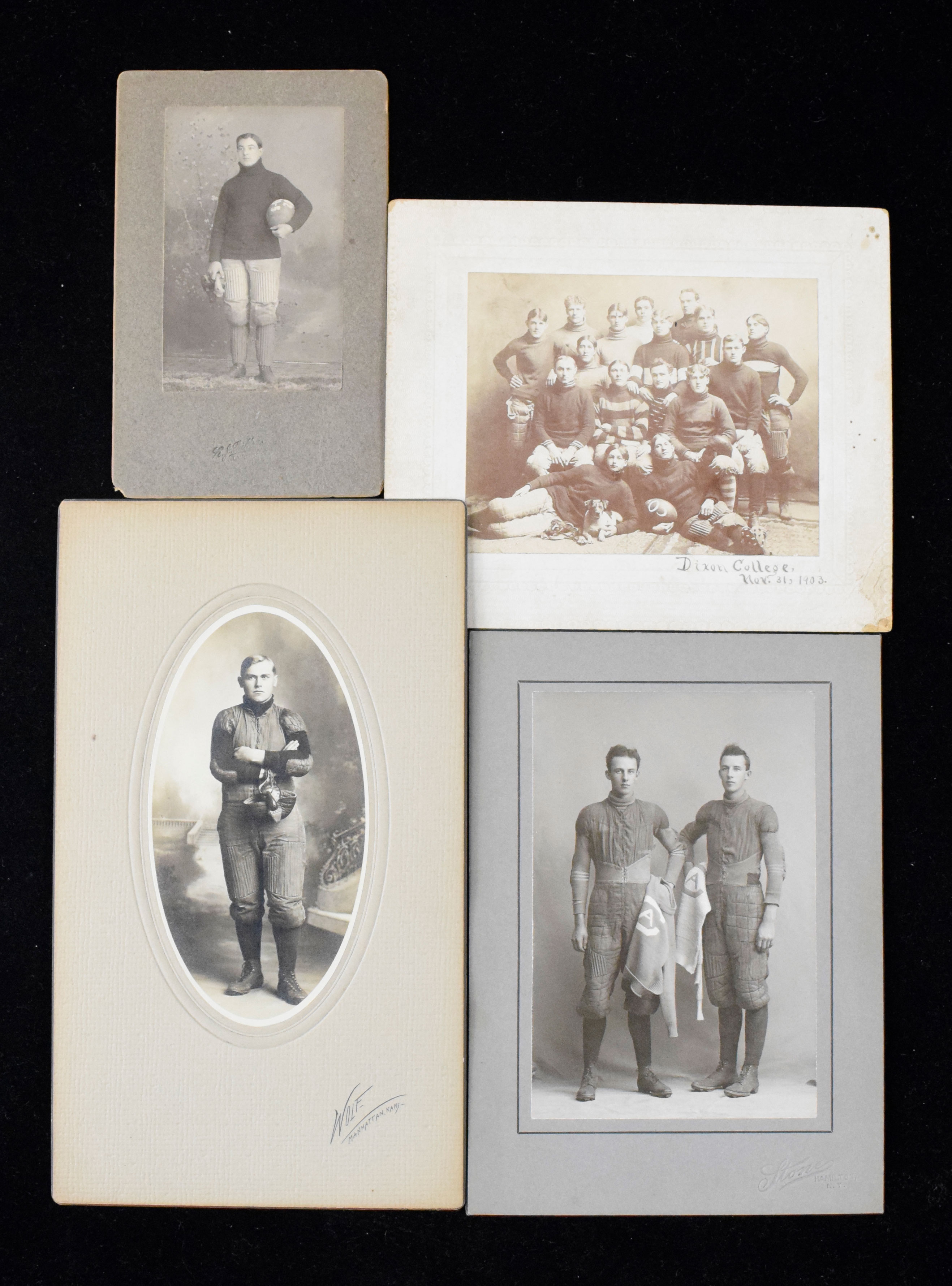 Description:Nice lot of (4) early football player/team photographs c.1890s-1900s (VG-EX/MT) Includes team photo on 5.5"x6.5" mount with handwritten identifier stating it is the 1903 Dixon College team; individual player photo on 3.5"x5.75" mount with notations on the back indicating that it shows a Cambridge High School player; photo of (2) uniformed players (each holding a sweater with "CA" on the front which is on 5.25"x7.5" mount marked "Stone" at lower front; exceptional image of a uniformed player holding leather helmet and morrill noseguard on 5.25"x9" mount which is marked "Wolf...Kans" at lower right. Varying degrees/types of wear throughout: VG-EX/MT