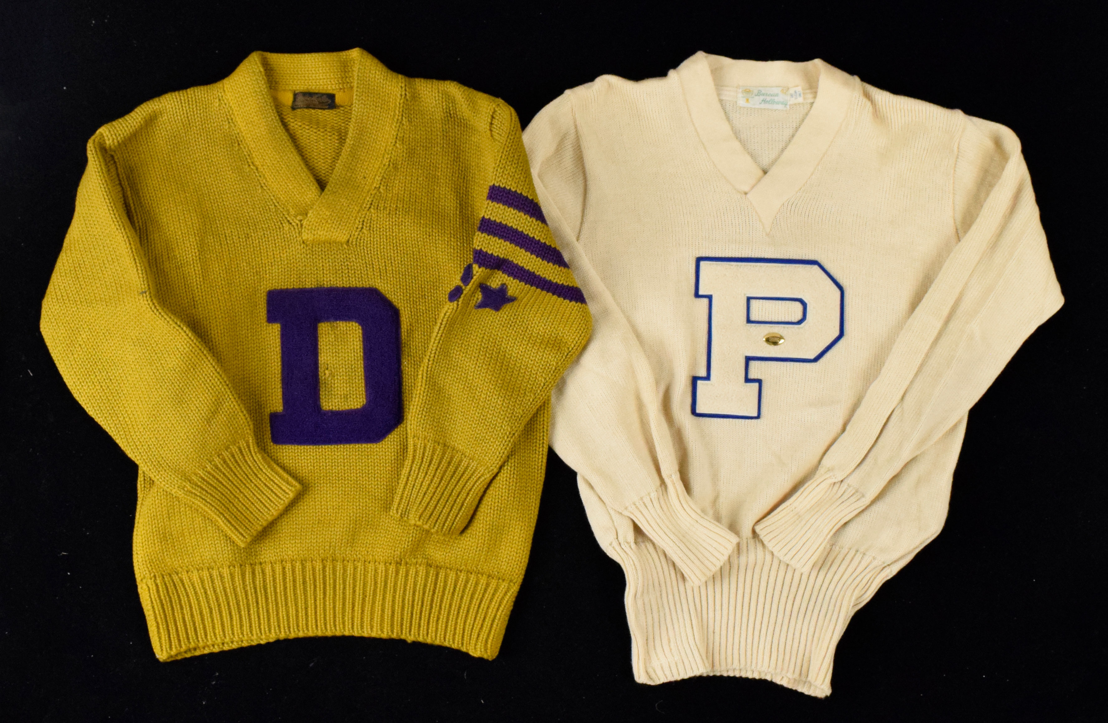 Description:Lot of (5) c.1930s-50s high school, college, and/or university sweaters (Avg. EX) Includes dark blue sweater with yellow "I" on front. "Wil Wite" tag in collar with "Miles" embroidered tag below; white sweater with white (outlined in blue) "P" patch on the front which has a football pin/decoration. "Burean Holloway" (size 42) tag in the collar and an embroidered tag inside reads "Gary Cox"; gold colored sweater with "D" on front and a "C" on the sleeve beside a star (possibly denoting Captain). "Art-Kote" tag in the collar; maroon sweater with white "H" on the front that has a basketball decoration and number "42." In the collar is a "Lamb Knite" tag; black sweater with "A" patch on the front that is done in red and yellow outlined black. "John Wanamaker" tag in the collar;