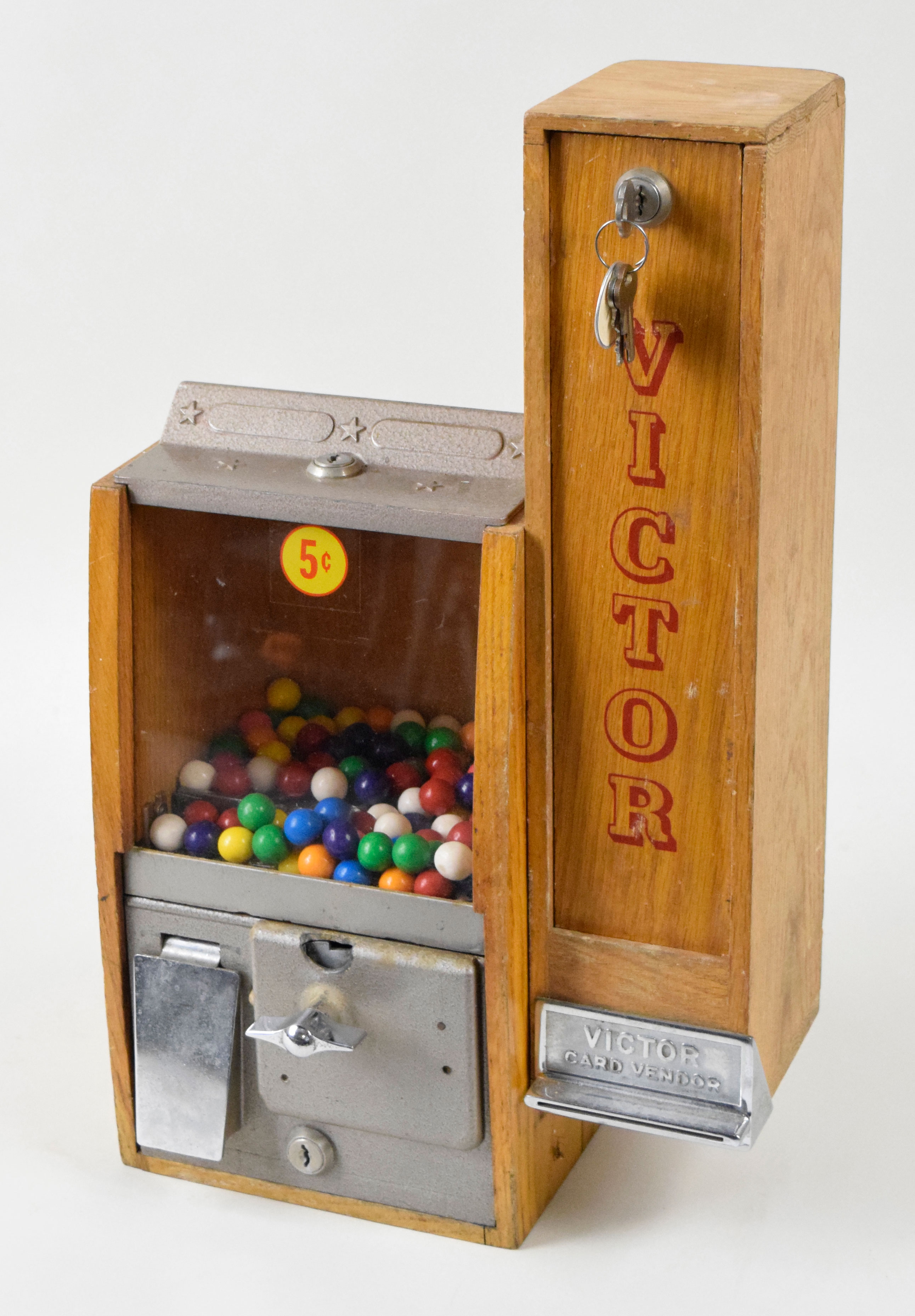 Description:c.1950s Victor "Card Vendor" - gumball machine and trading card dispenser (EX) Gumball machine has a an additional section affixed to the right side which would dispense a trading card with purchase. The side portion has "Victor Card Vendor" marked card dispensing slot and "Victor" lettered on the door. Light/mild use and some general age related wear. Includes keys which open two of the three locked portions. 18.5" tall with 6"x11" footprint: EX