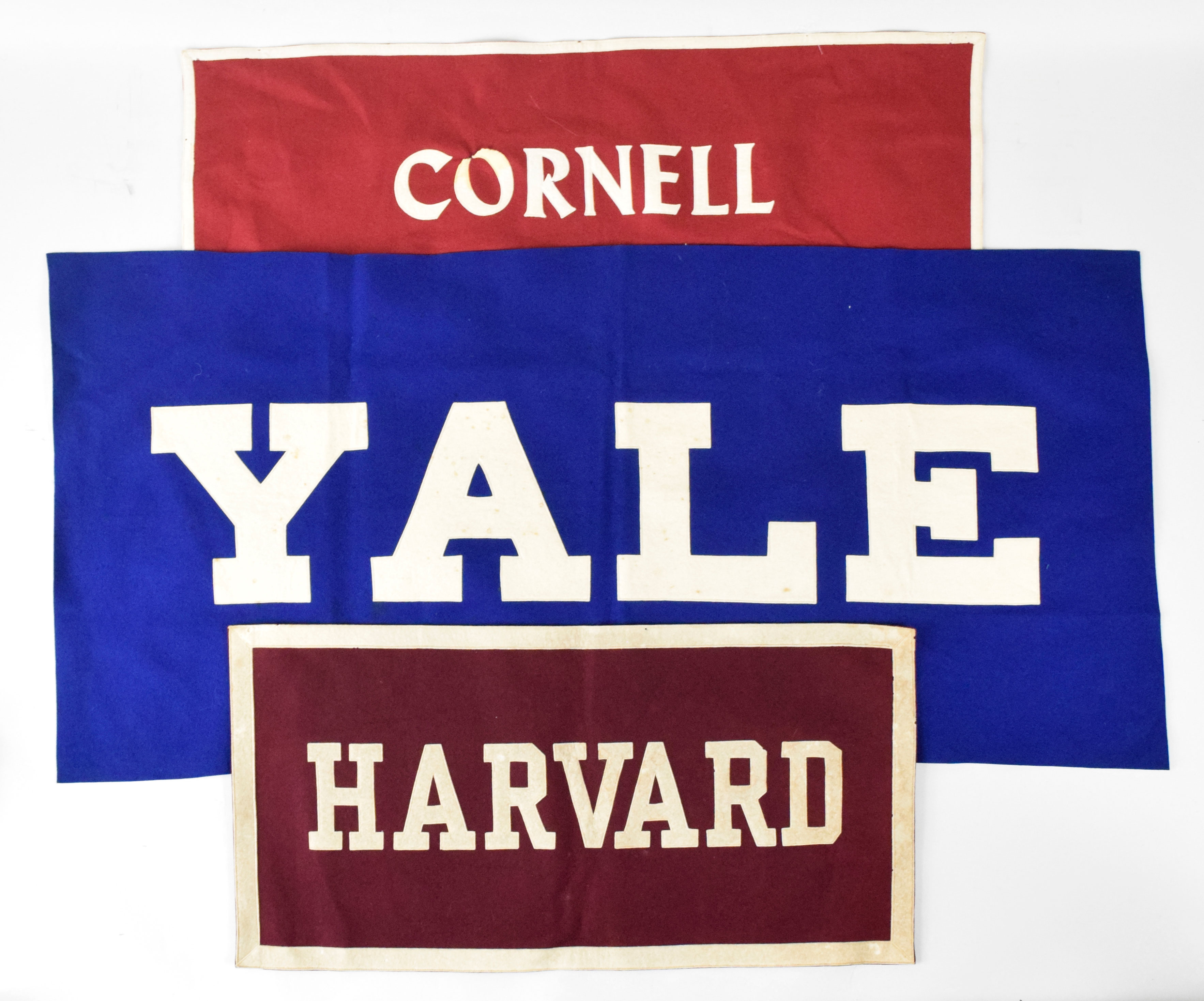 Description:Lot of (6) c.1920s-40s College or University felt banners (Overall EX) Includes Michigan; Rutgers (dated 1934); Harvard; Navy; Yale; and Cornell. Sizes range from 14.25"x28" to 21.5"x46". Varying degrees of light to mild scattered wear: Overall EX