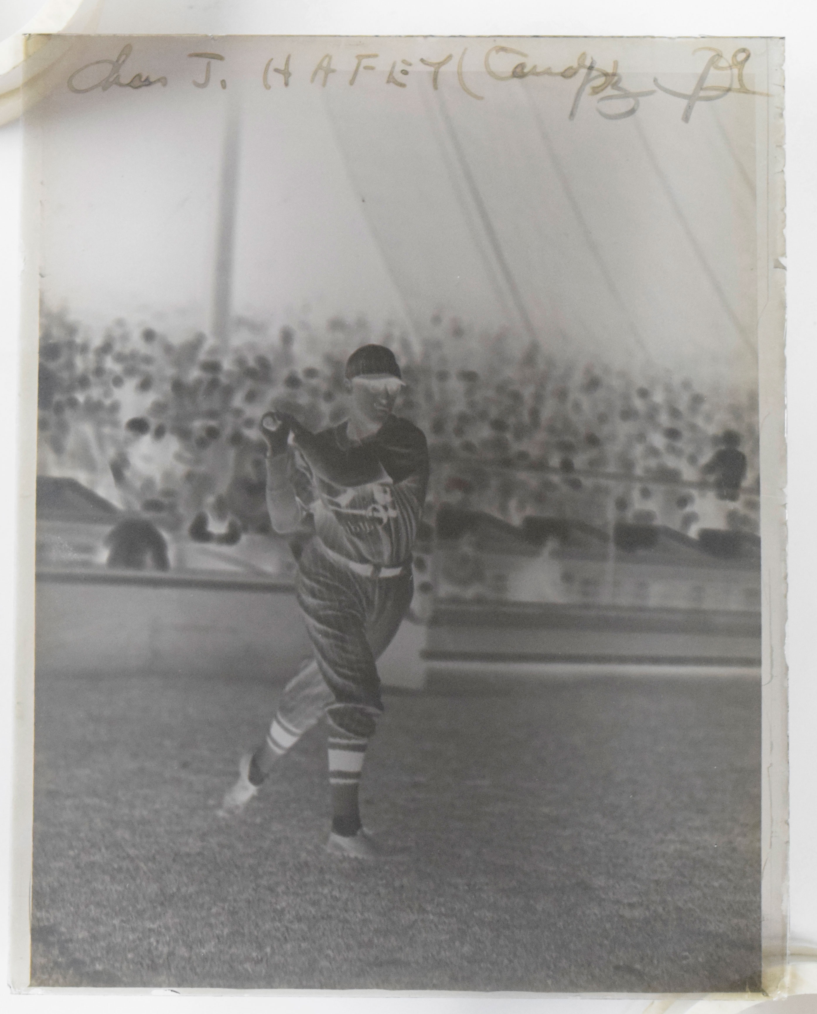 Description:c.1929 Chick Hafey glass plate negative attributed to Charles Conlon (likely his 34 Goudey image) (EX) Original glass plate negative has markings done in the same style as other Conlon pieces and comes with the original paper envelope (chipping/wear/separations) which appears to have his handwritten notations. It is likely that this is the image which was used on Hafey's 1934 Goudey card: EX