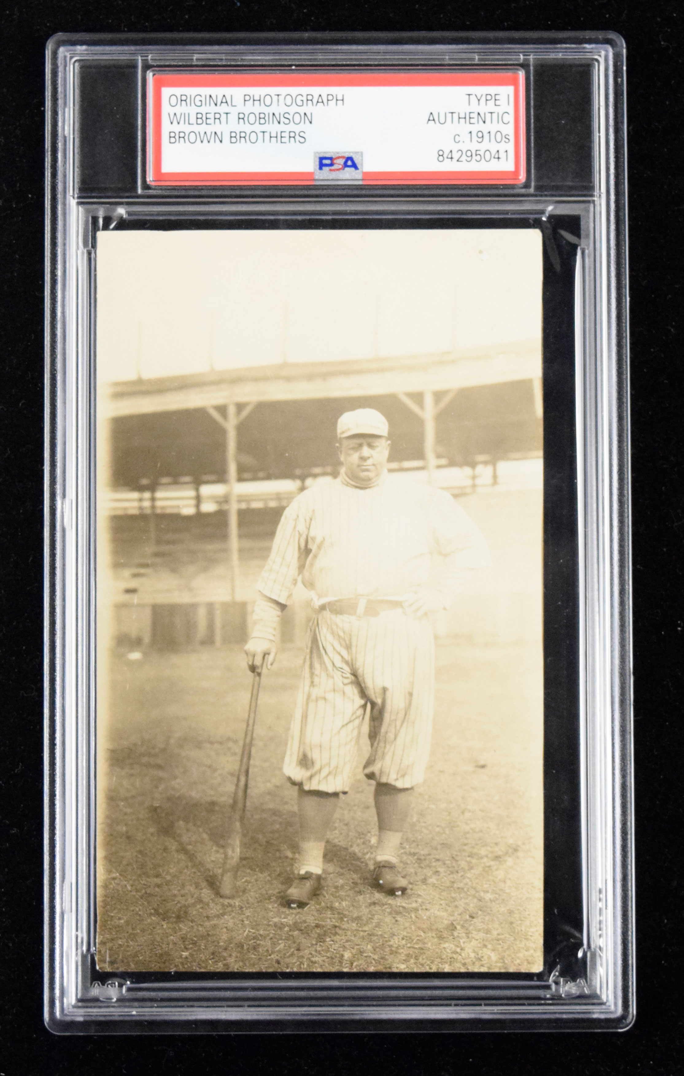 Description:c.1910s Wilbert Robinson photograph by Brown Brothers (PSA Type I) (VG/EX) Sepia toned 3.25"x5.25" photo showing Robinson in uniform has handwritten identifier and "Brown Bros." stamp on back. Touch of light wear: VG-EX