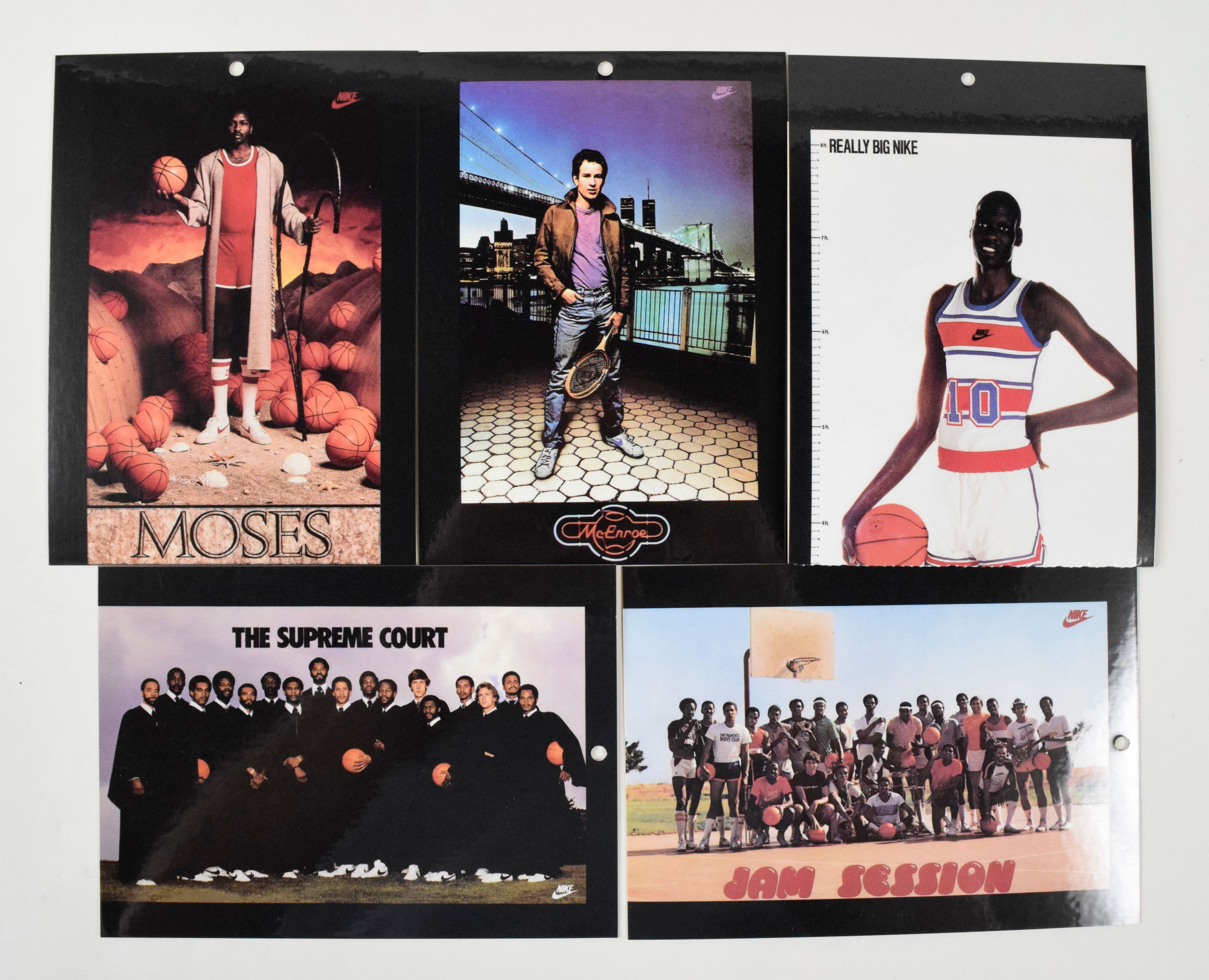 Description:Lot of (33) 1982-85 Nike Poster Cards in original box (Avg. NM) Nice lot of 5"x7" poster cards are in average NM condition with a few grading slightly lesser. Includes The Supreme Court, Iceman, Moses, Jam Session, McEnroe, Speedsters, Board Room, Air Force I, Steeler Pounder, Air Force, Really Big Nike, and others. Box has small tear and some other handling and storage wear: Avg. NM